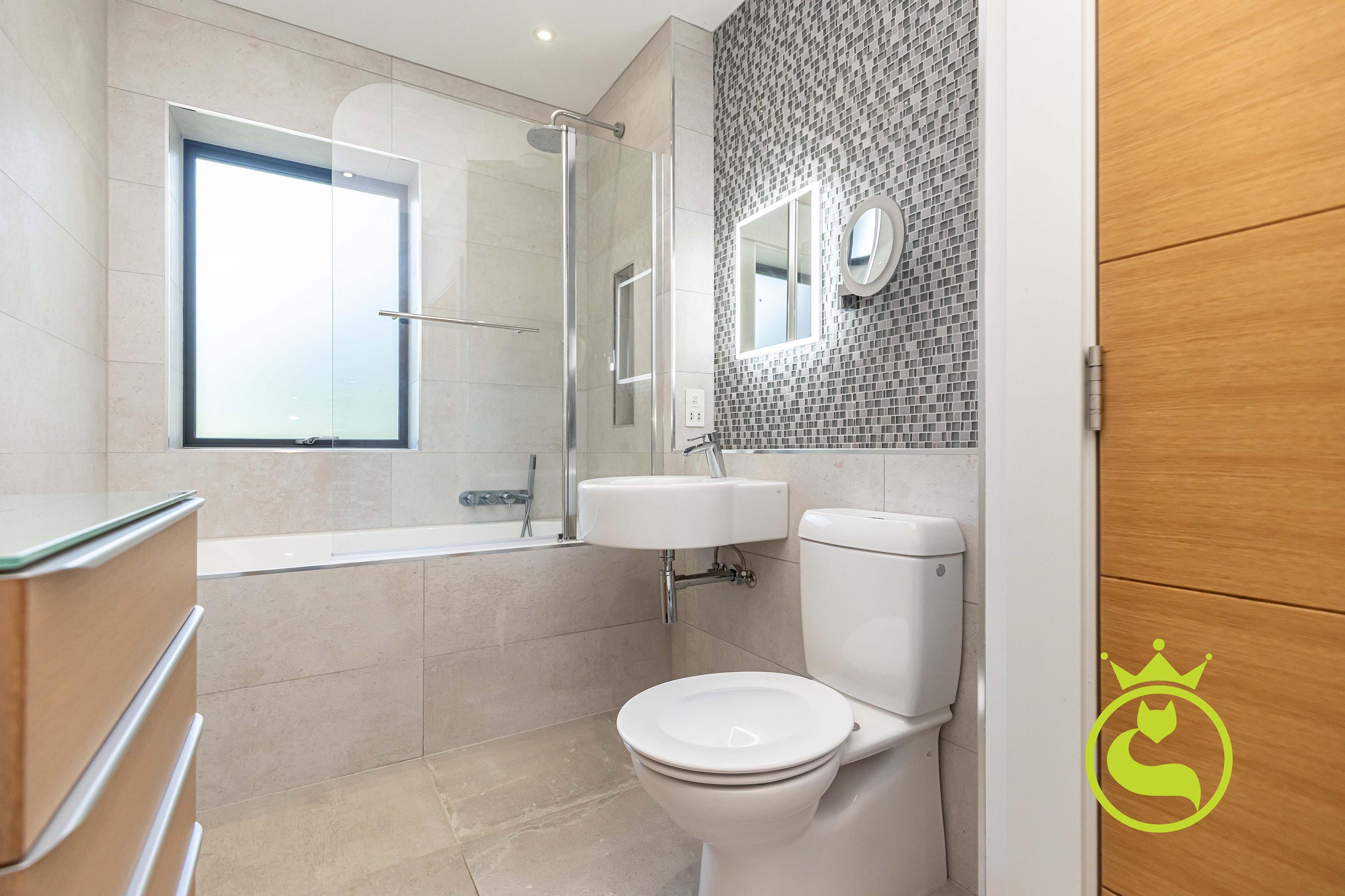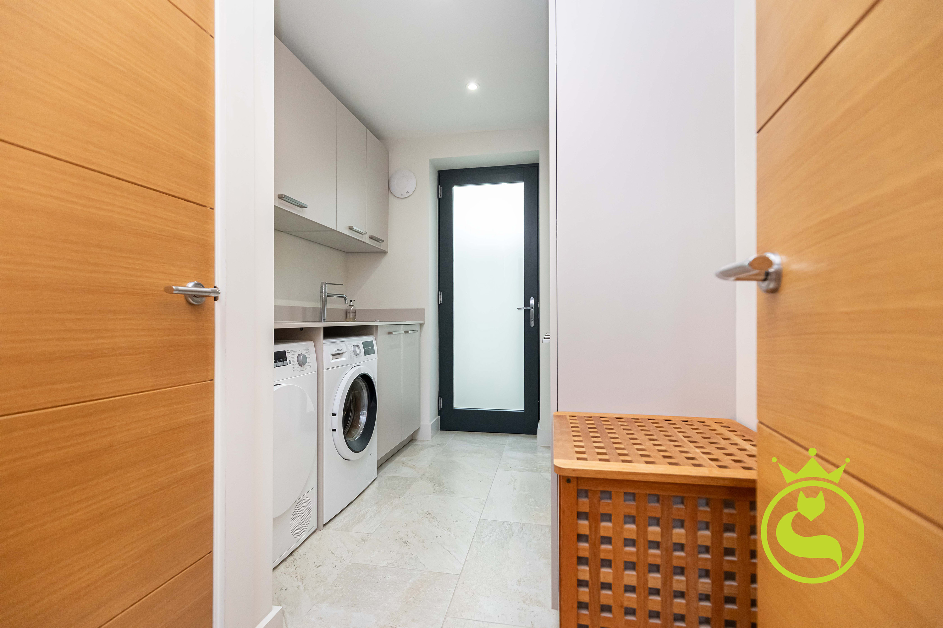 The lower ground floor is wonderfully versatile offering a further double bedroom with ensuite and a large private guest suite with double bedroom, all-embracing bathroom and a sitting area with bi-fold doors to a terrace – ideal for visitors, teenagers or even as an independent living space. There is also a well fitted utility room with personal door to the outside where you will find the boiler room ideal for drying water sports equipment or additional storage to the garage also, with the benefit of a water softner.