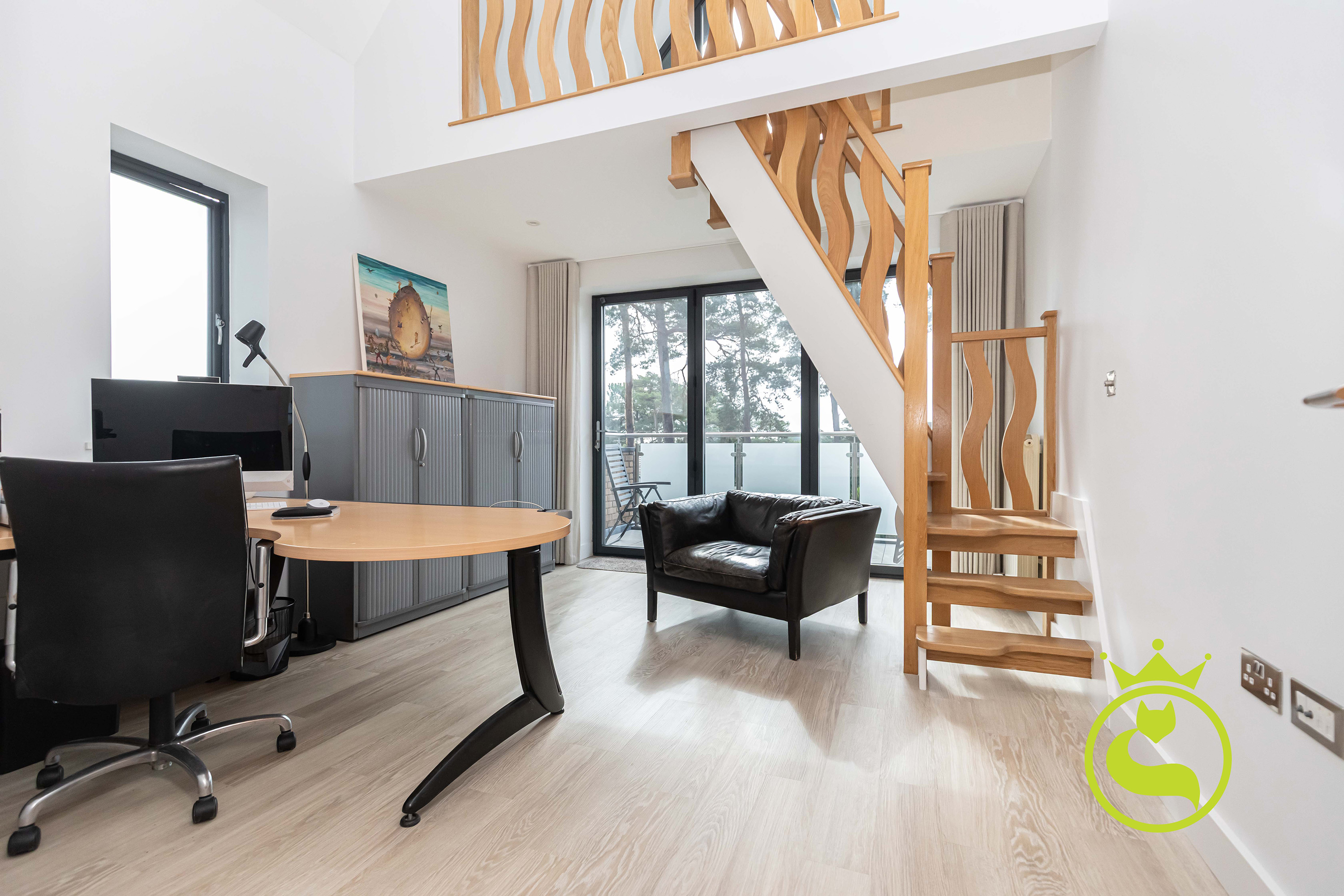 Flexible top-floor, vaulted ceiling studio/bedroom with mezzanine over boasting panoramic views and coastal sea-view glimpses