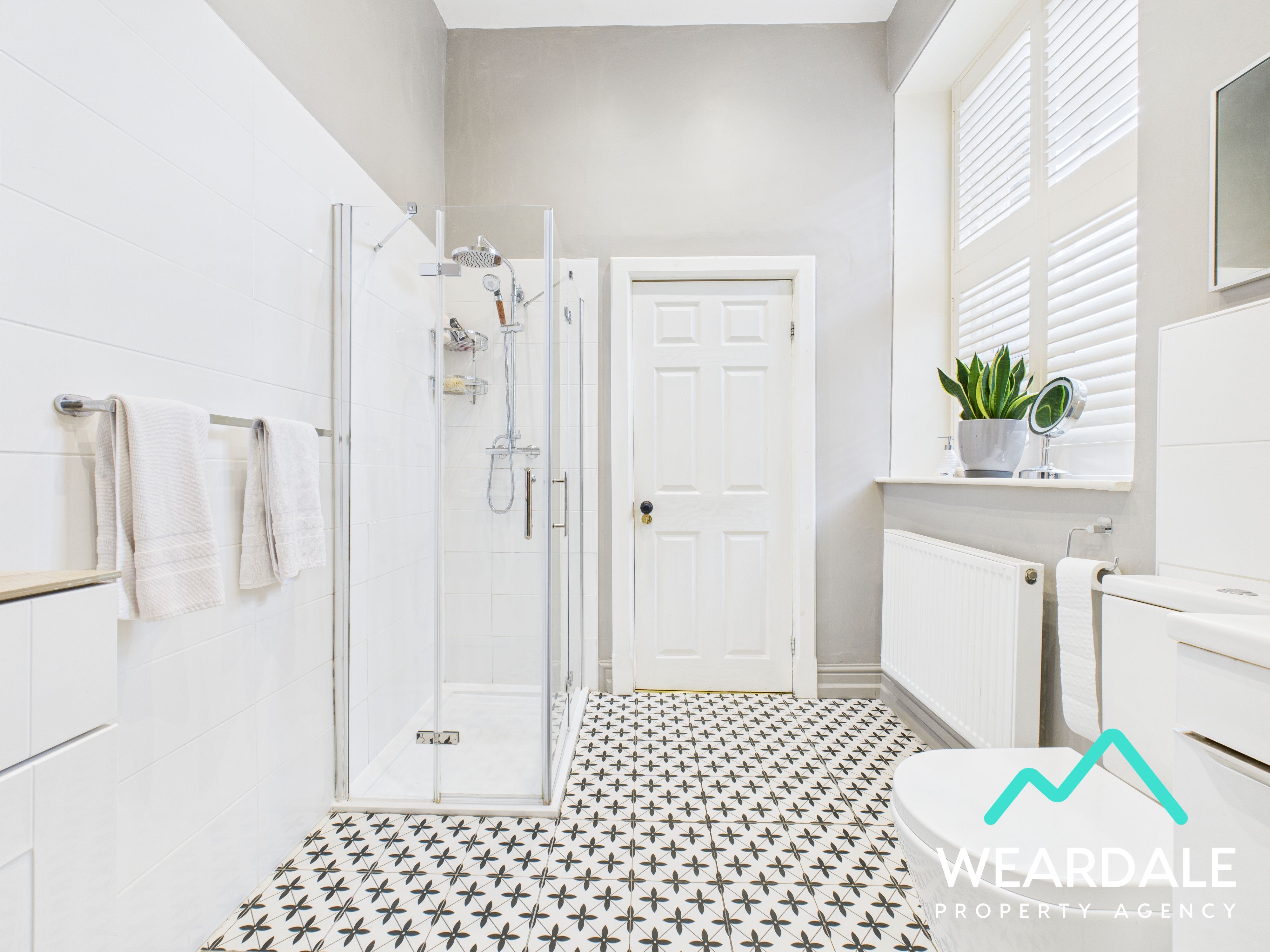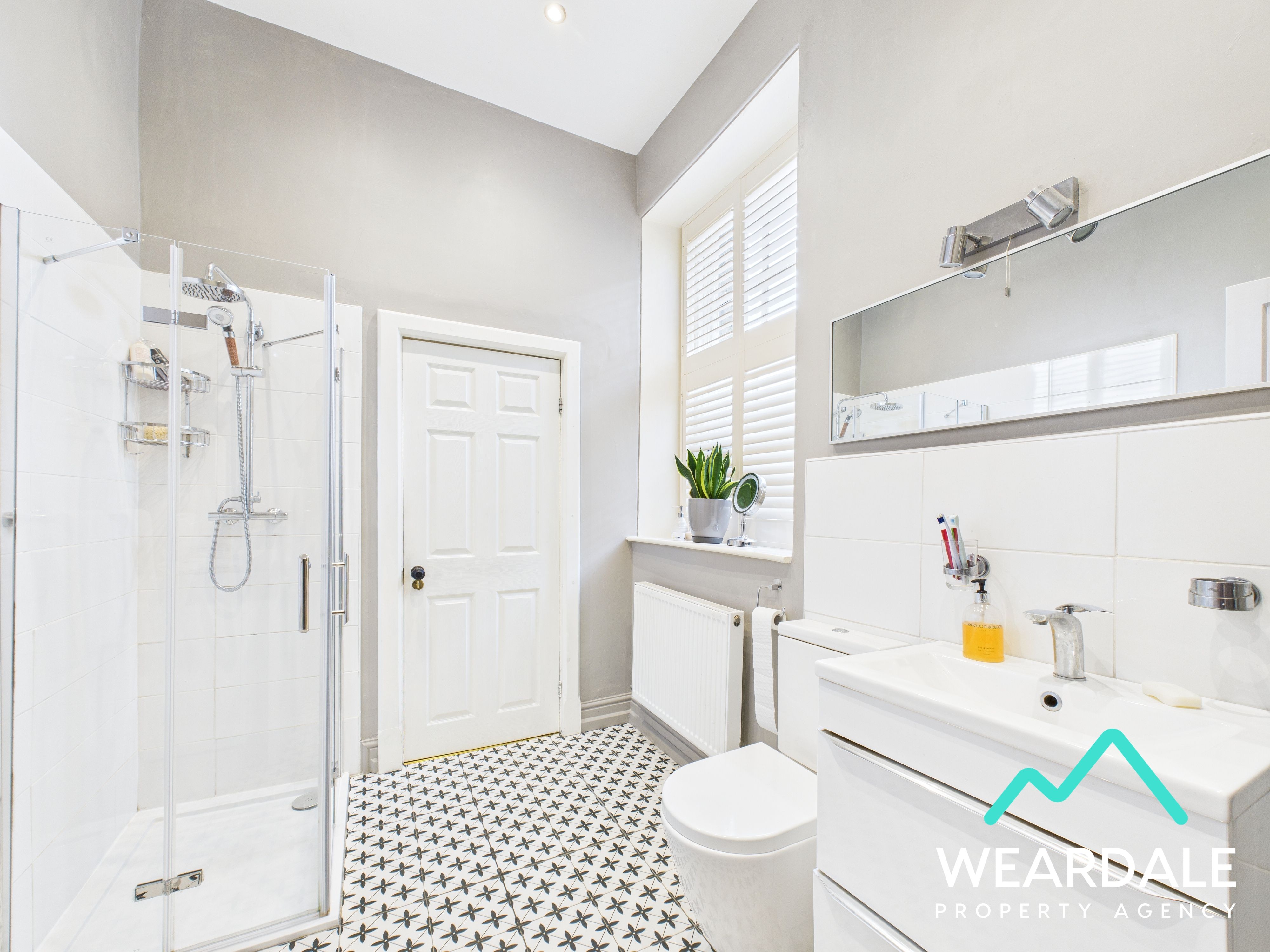 - Positioned to the middle of the property on the Western side, and accessed from the rear hallway and reception room / bedroom 6 - Wooden framed window with plantation shutters, to the Western aspect - Tiled flooring - Neutrally decorated - Corner shower cubicle, with fully tiled walls, mains-fed shower, and overhead rainfall showerhead - WC - Hand-wash basin with tiled splashback set on a vanity unit, providing integrated storage drawers below - Storage cupboard - Ceiling spotlights - Wall mounted heated towel rail - Radiator