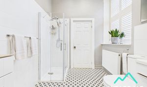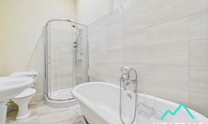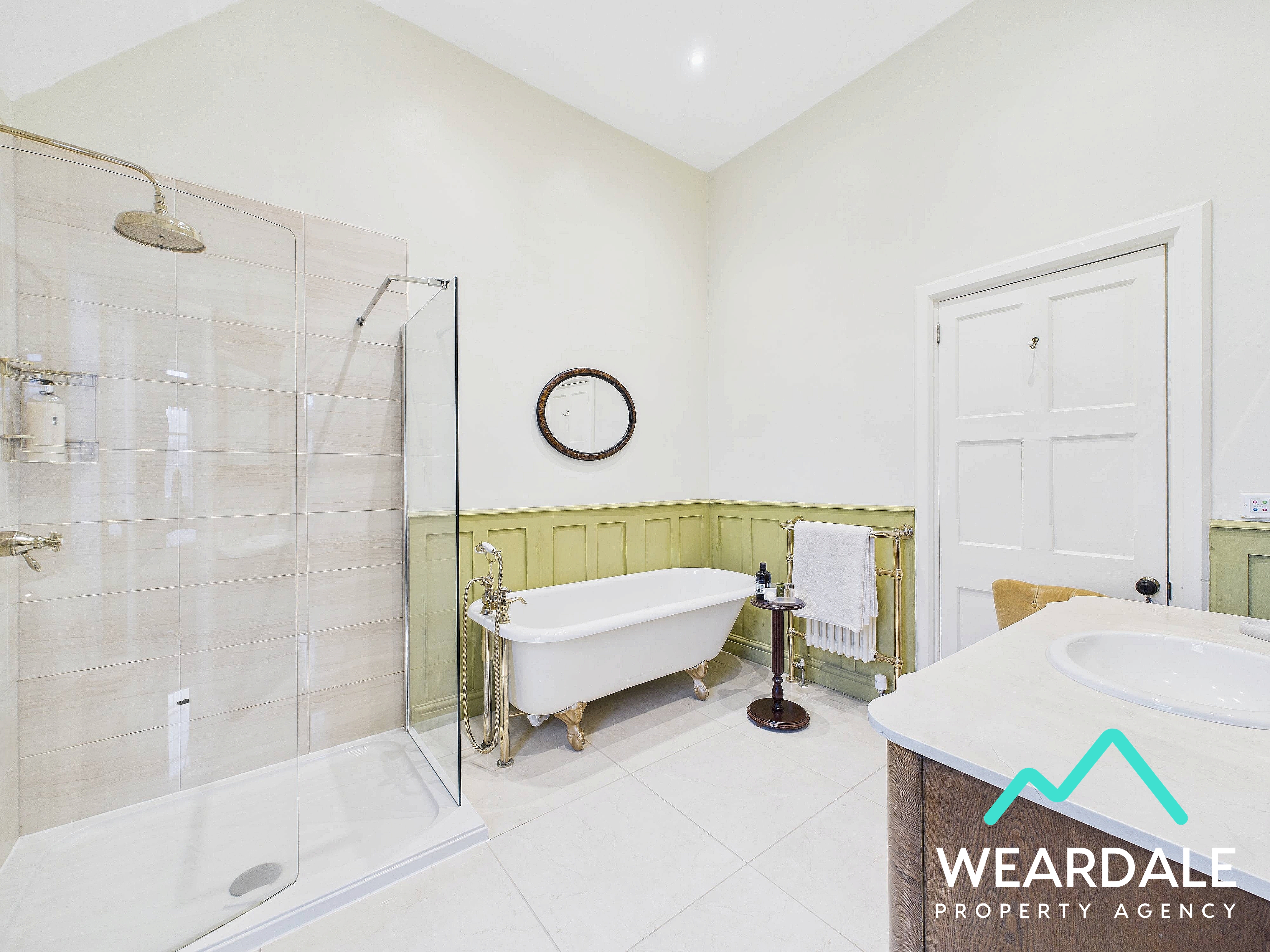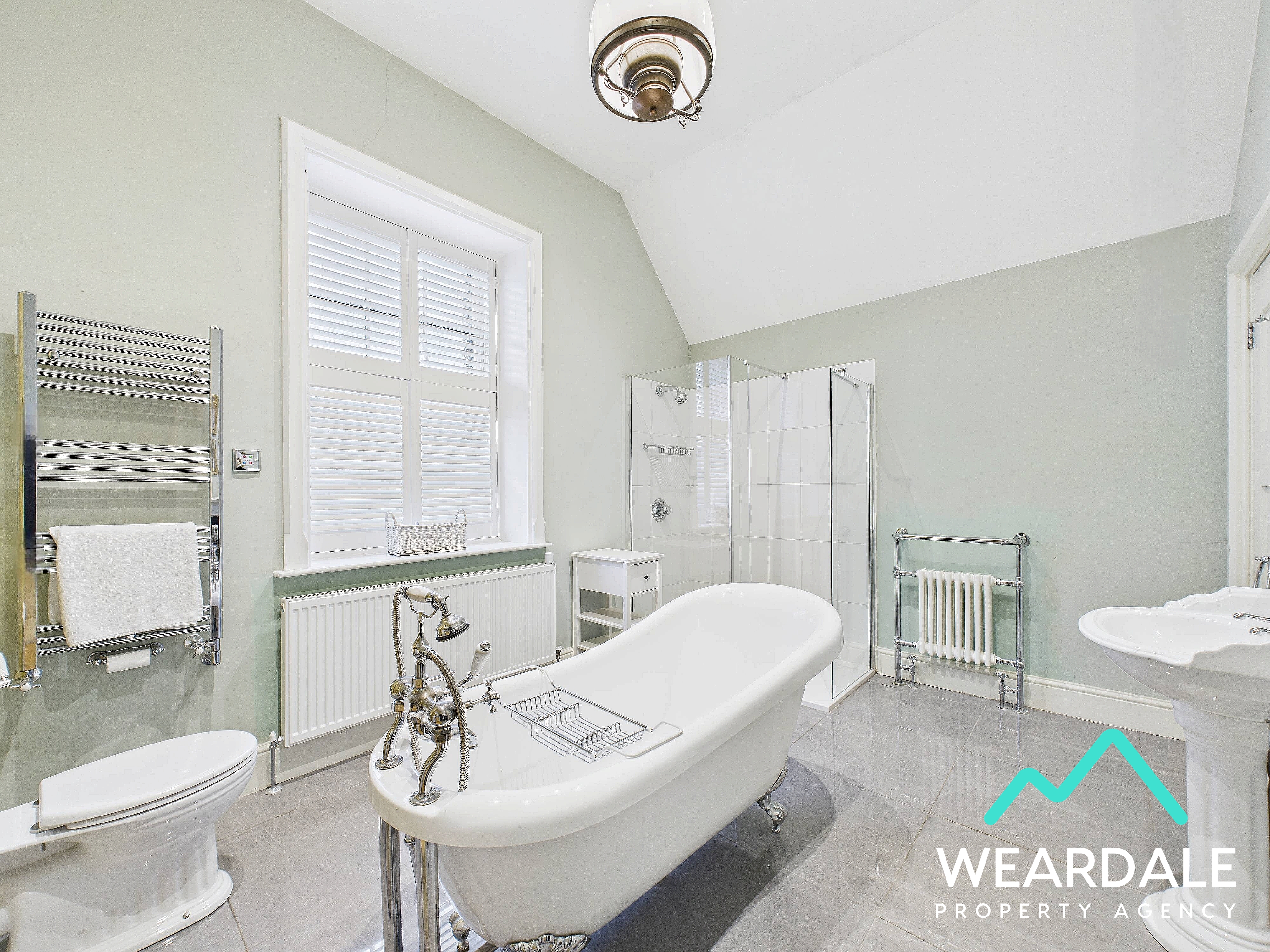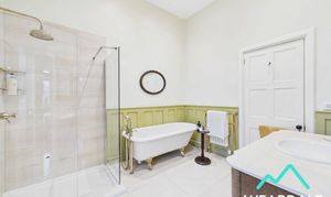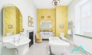 - Accessed directly from bedroom 5 - Large and impressive bathroom - Wooden framed window with plantation shutters to the Western aspect - Tiled flooring - Underfloor heating - Walk-in corner shower, with tiled enclosure and mains-fed shower - Free-standing roll top bath - WC - Hand-wash basin with tiled splashback - Feature fireplace with wooden mantle - Central ceiling light fitting - Two radiators - Wall mounted heated towel rail - Ample space for free-standing furniture