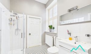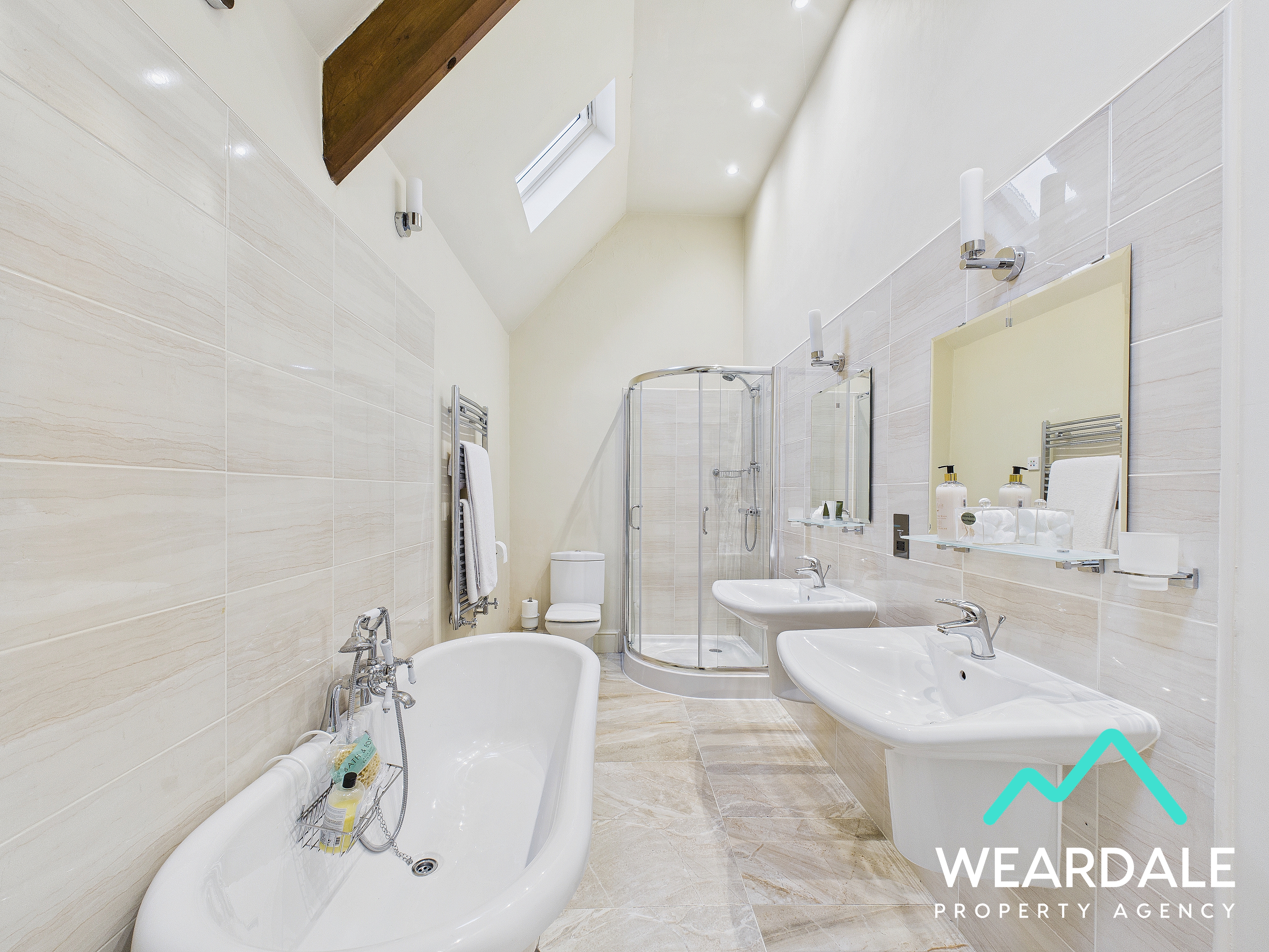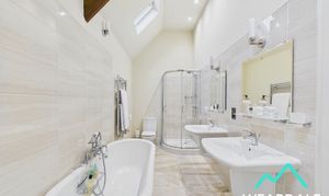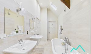- Positioned between bedrooms 3 & 4, and accessed directly from both - Two roof light windows to the northern aspect - Tiled flooring - Underfloor heating - Neutrally decorated - Exposed wooden ceiling beam - Corner shower cubicle with tiled enclosure, and mains-fed shower - Free-standing roll top bath - WC - Two hand-wash basins with tiled splashbacks - Ceiling spotlights - Wall mounted light fittings - Radiator - Wall mounted heated towel rail