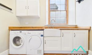 - Positioned to the front and Western side of the property, and accessed from the rear hallway - Wooden framed multi-paned sash window, with half frosted panes to the Western aspect - Tiled flooring - Neutrally decorated - Wall mounted high-level storage cupboard - Wooden work-surfaces with under-counter storage cupboards - Belfast sink - Plumbing for washing machine and tumble dryer - Two ceiling light fittings - Radiator - The property’s oil system boiler is located here