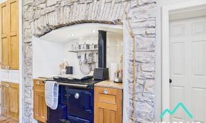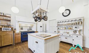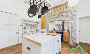 - Positioned to the front of the property towards the Western side, and accessed from the rear hallway - Large kitchen area - Wooden framed multi-paned sash window to the Northern aspect - Wooden flooring - Neutrally decorated - Exposed stone wall to the Western side, which features an oil-fired Rayburn which benefits from the option to run the property's central heating (independent of the main boiler) - Free-standing central island with tiled work-surface and under-counter storage cupboards and drawers - Granite work-surfaces with under-counter storage cupboards - Double Belfast sink - Free-standing range cooker (fuelly by externally housed LPG cylinders) with overhead extractor - Built-in storage cupboard - Access to pantry (3.04m x 1.11m) - Space for free-standing appliances - Four ceiling light fittings