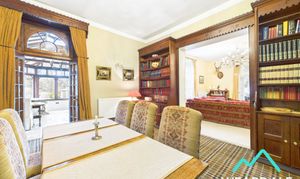 - Positioned to the front and Eastern side of the property, accessed from the main hallway, and providing onward internal access to the orangery and lounge - Formerly the library and more recently used as a dining room - Carpeted - Multi-fuel burner set within a tiled fireplace with wooden mantle - Integrated original Victorian storage furniture - Large walk-in store cupboard - Wooden sliding doors provide access to the adjoining lounge, with the option to be closed to give separation between the two reception rooms - Ceiling light fitting and wall mounted light fittings - Radiator