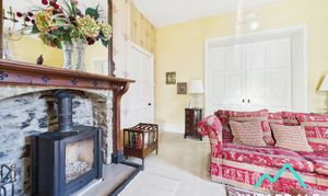 - Positioned to the Eastern side of the property, accessed from the dining room and main hallway, and providing onward access to the garden room - Large lounge area - Wooden framed multi-paned sash window to the Eastern aspect, looking over the gardens and providing beautiful views of the surrounding hillsides - Carpeted - Multi-fuel burner set on a tiled hearth, with brick surround and wooden mantle - Wooden sliding doors provide access to the adjoining dining room, with the option to be closed to give separation between the two reception rooms - Central ceiling light fitting - Radiator - Ample space for free-standing lounge and storage furniture