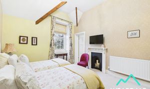 - Positioned to the rear of the property at the Southwestern corner and accessed from the landing - Large double bedroom with En-suite - Two wooden framed multi-paned sash windows to the Southern aspect, providing fantastic views of the surrounding hillsides - Carpeted - Exposed wooden ceiling beams - Feature fireplace set on tiled hearth, with tiled surround and wooden mantle - Ceiling light fitting - Radiator - Ample space for free-standing storage furniture