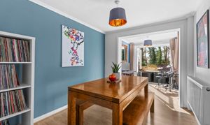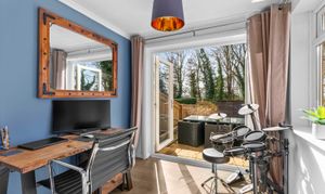 - Open plan sitting room with feature wood burning stove leading to dining area and further study area with patio doors to garden