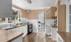 - Modern kitchen with integrated appliances leading to useful utility room with door to garden