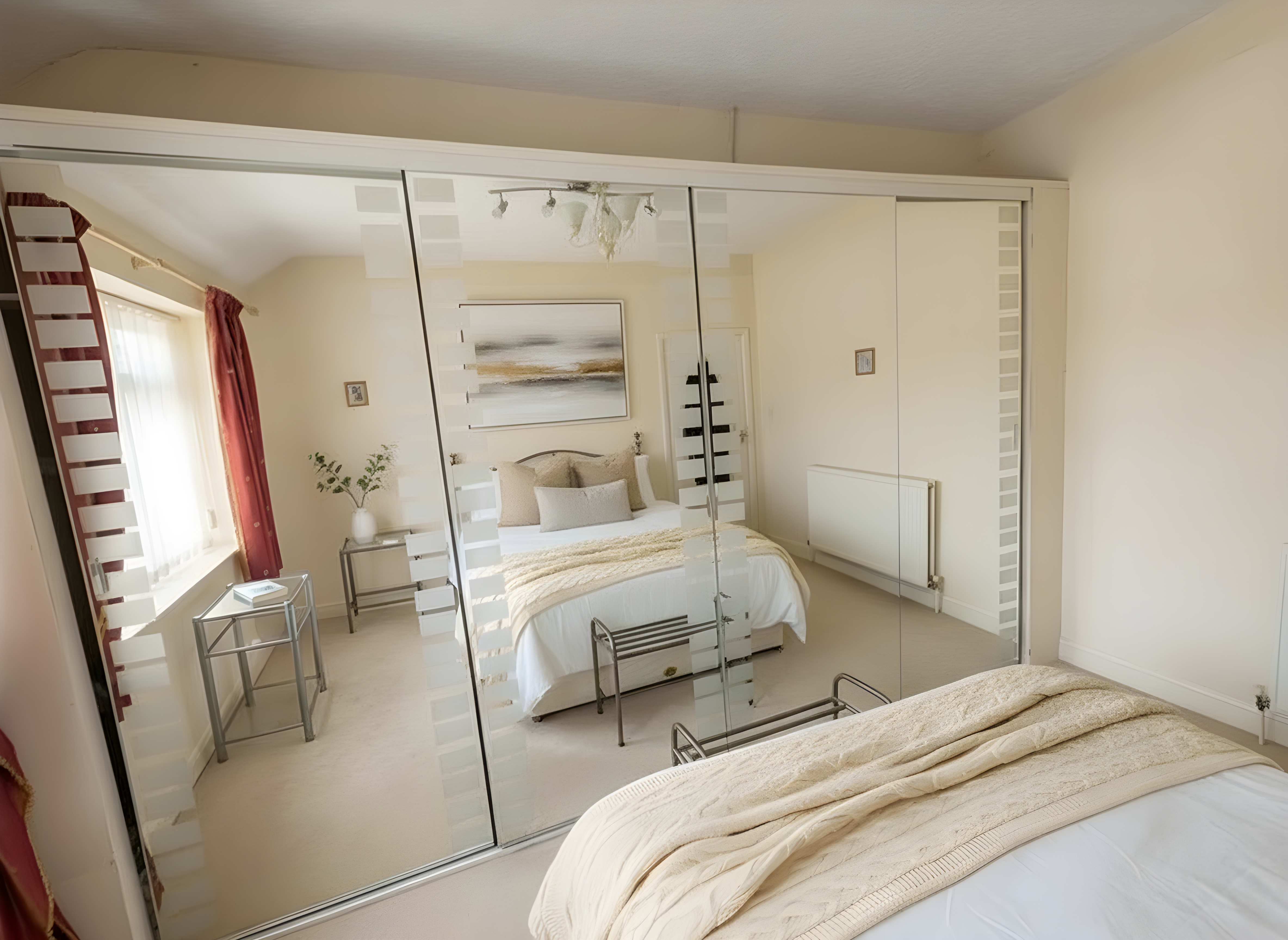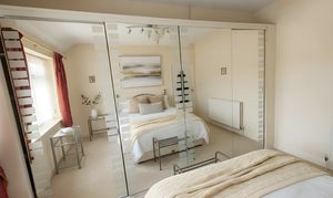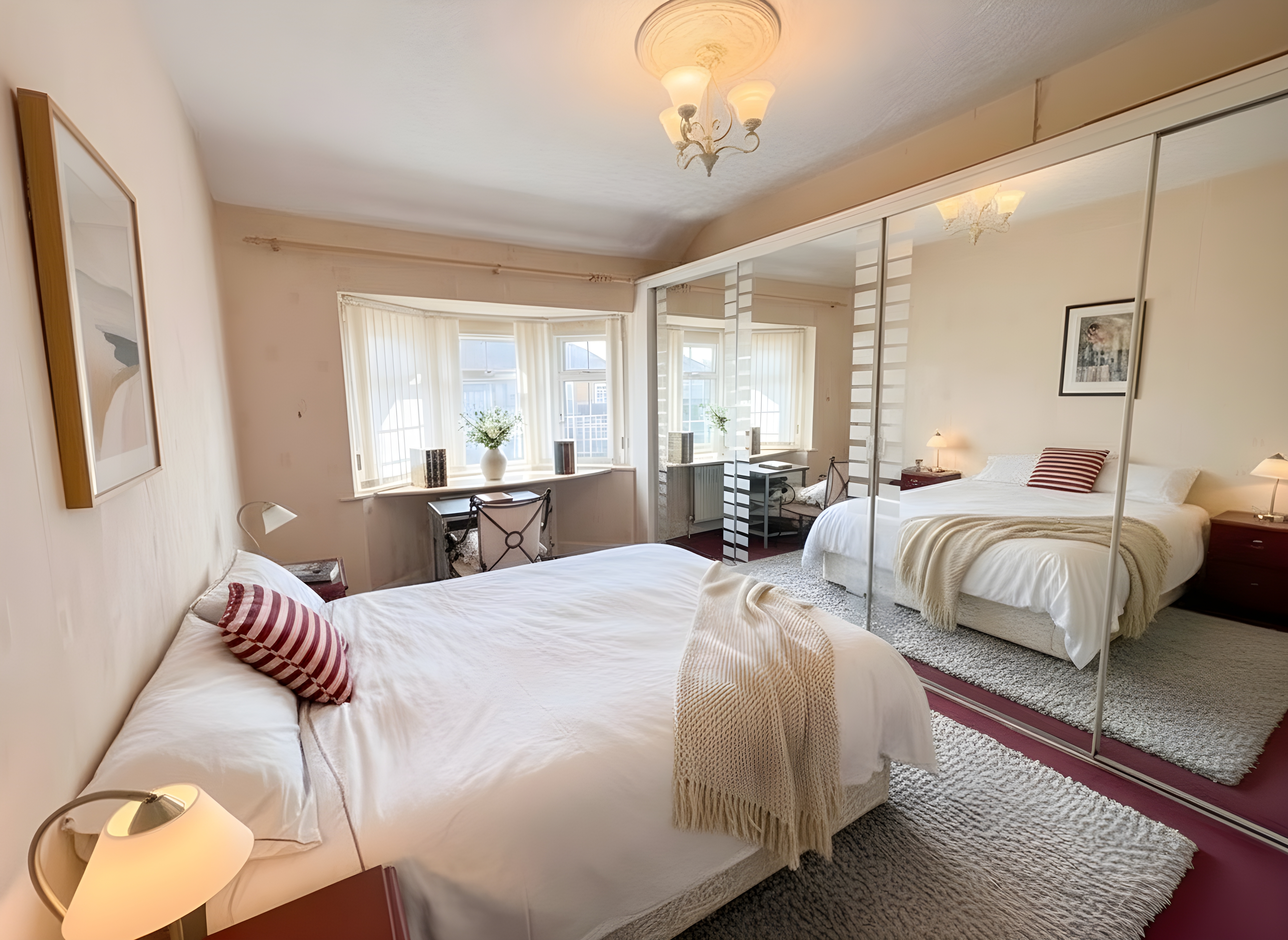 Upstairs, the property features three well-proportioned bedrooms, including a master bedroom fitted with mirrored sliding wardrobes, offering convenient and stylish storage solutions.