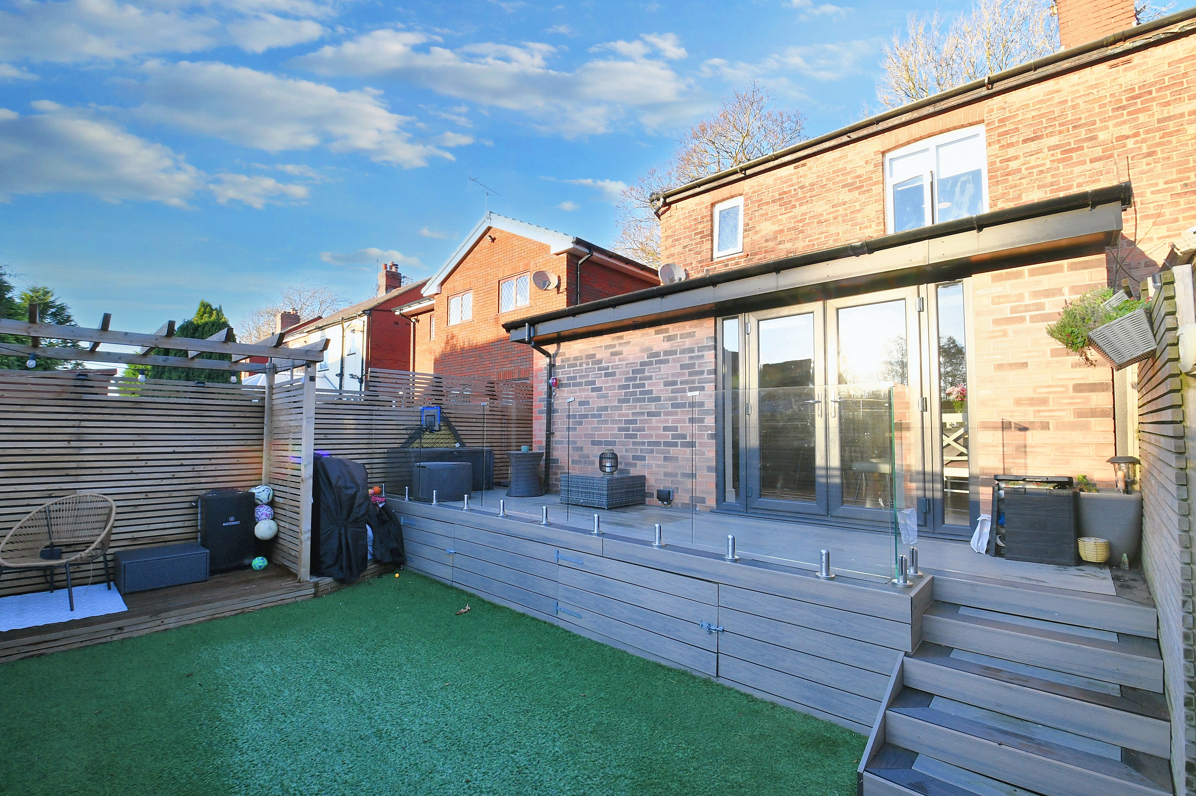 To the front, there is a driveway for off-road parking - and the added benefit of an EV Charger. To the rear there is a landscaped south-facing garden complete with artificial grass and decking!