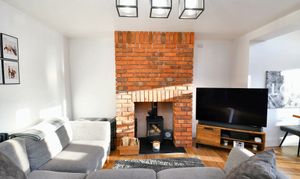 This room features contemporary fitted units, a kitchen island, a brick-feature fireplace, skylights and patio doors to the rear that let plenty of natural light in.