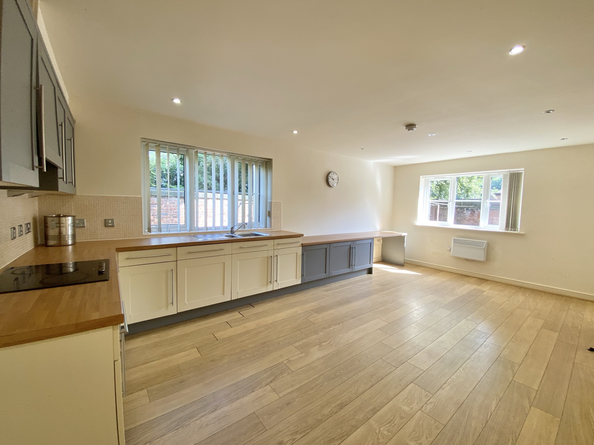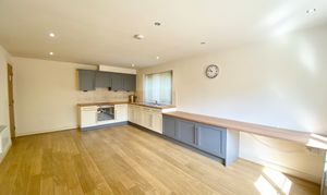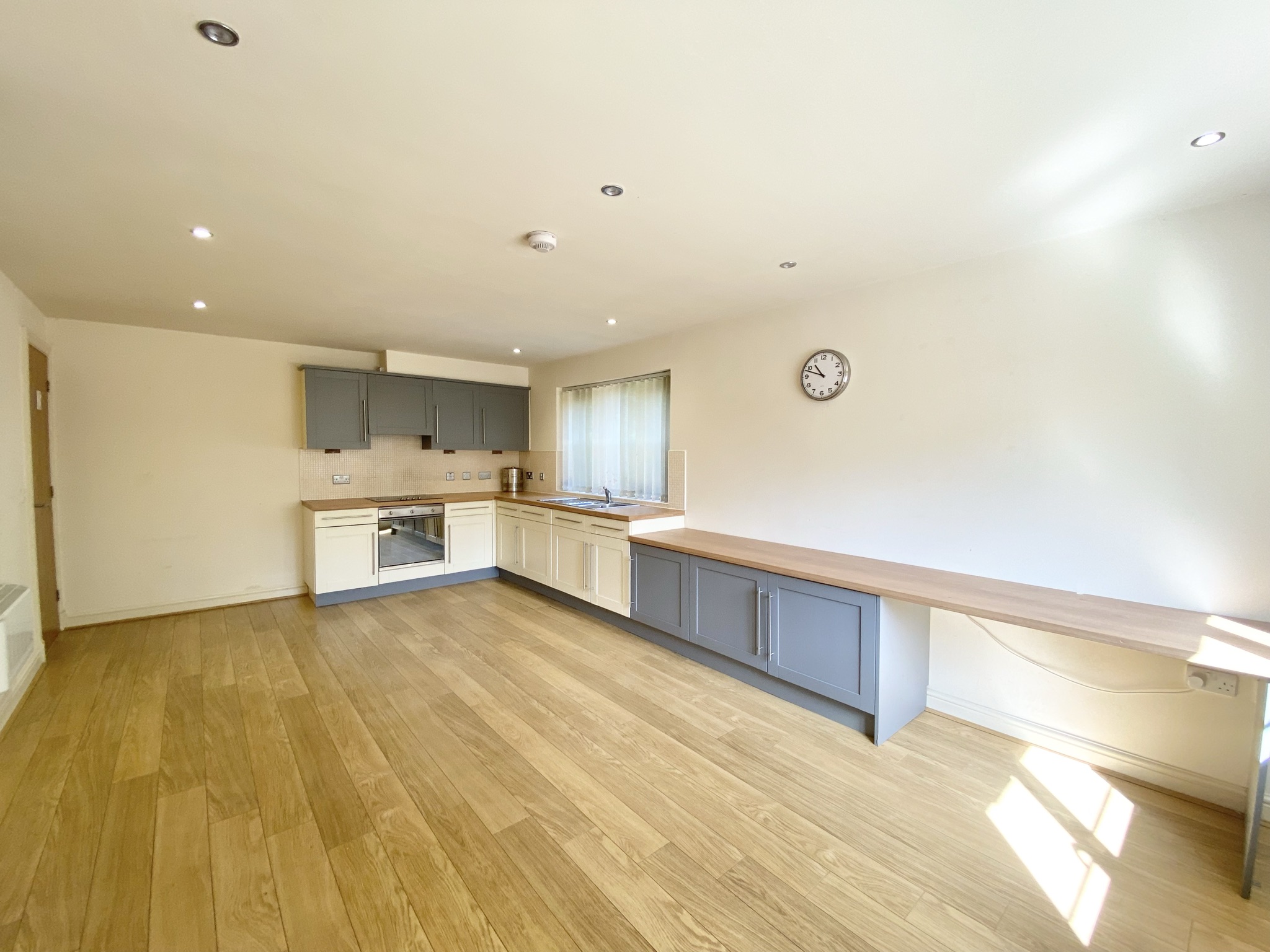 Dual aspect with a window to the front and side elevations. Inset spotlights. Fitted with a range of wall and base units complete with integrated oven, hob and extractor hood. Internal door leads through to: