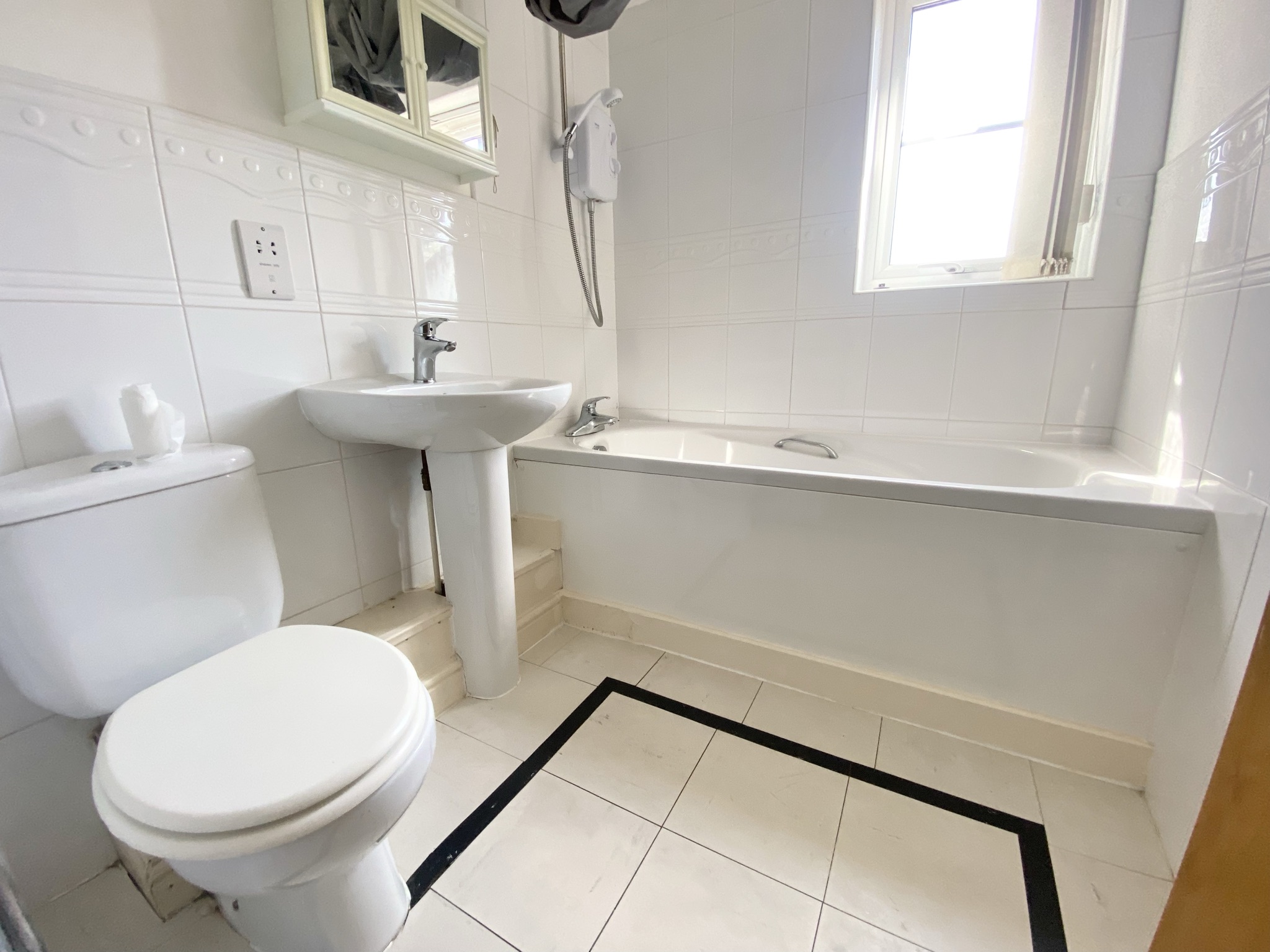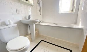 Window to the front elevation. Fitted with a bath with a shower over, a low level W.C and a pedestal hand wash basin. Tiled walls and floor.