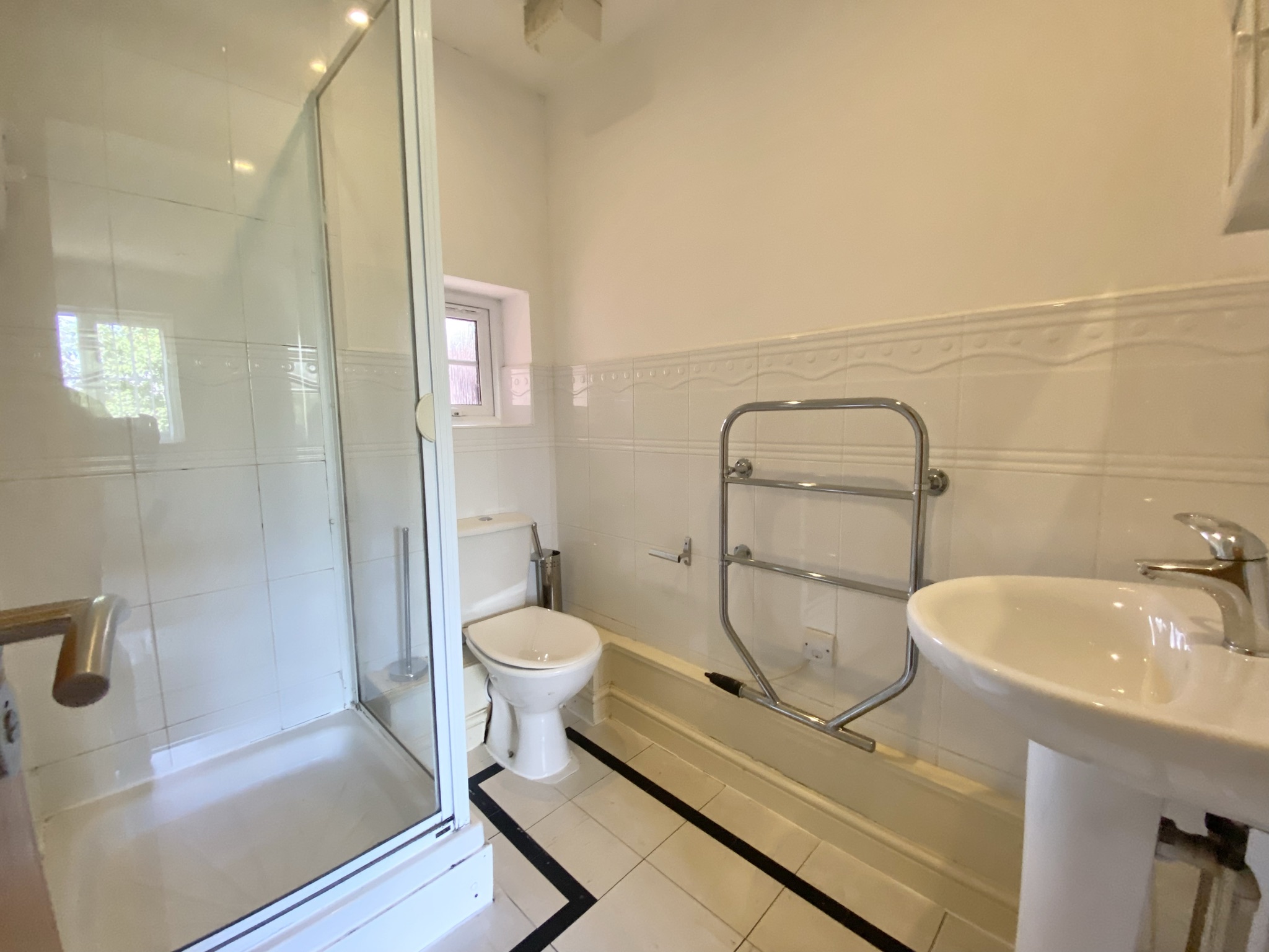 Window to the side elevation. Fitted with a shower cubicle, low level W.C and a pedestal hand wash basin. Part tiled walls.