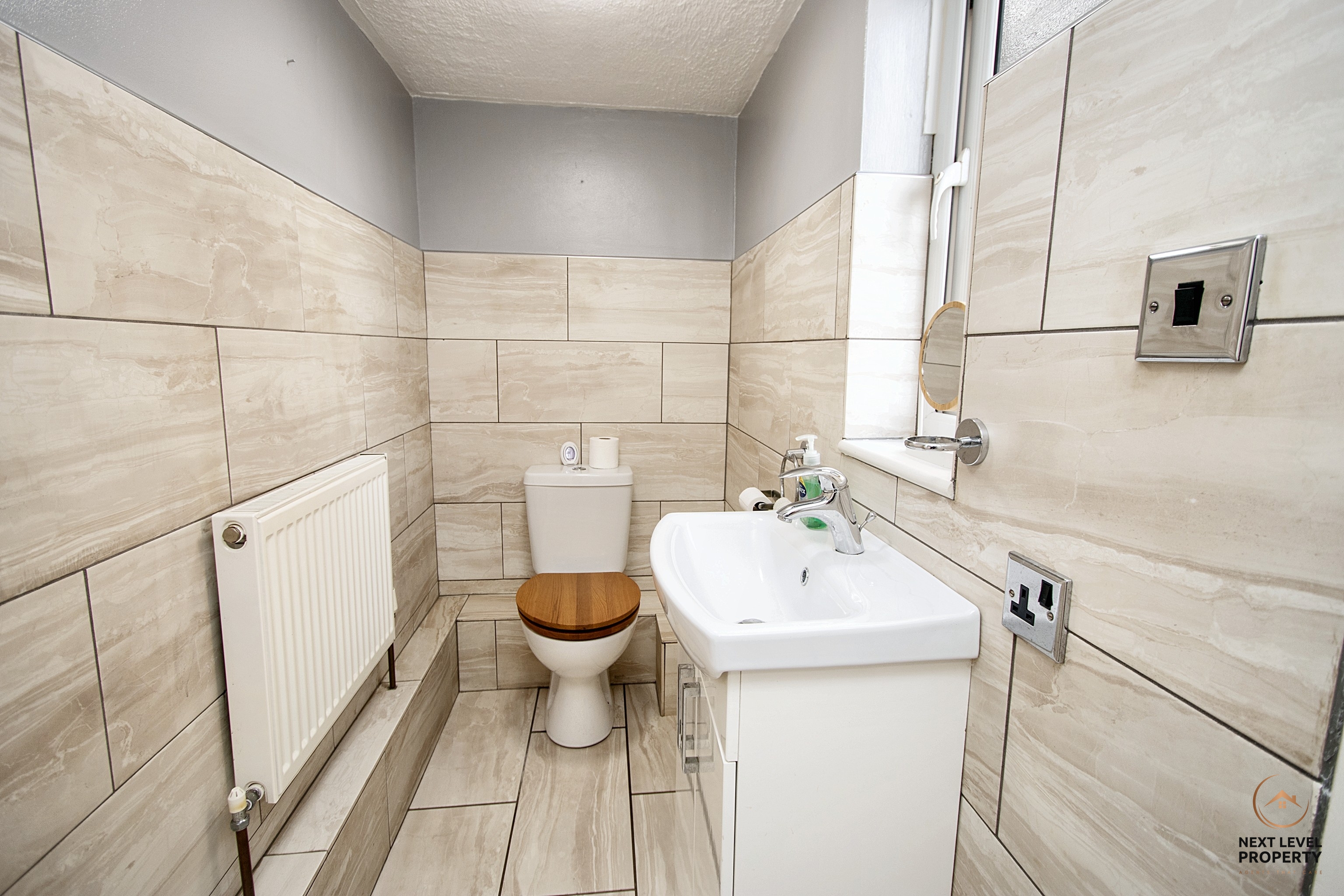 The cloakroom has a fitted low level wc and a hand basin set to a compact vanity unit. The floor and majority of the walls are tiled and there is a uPVC double glazed window to the side.