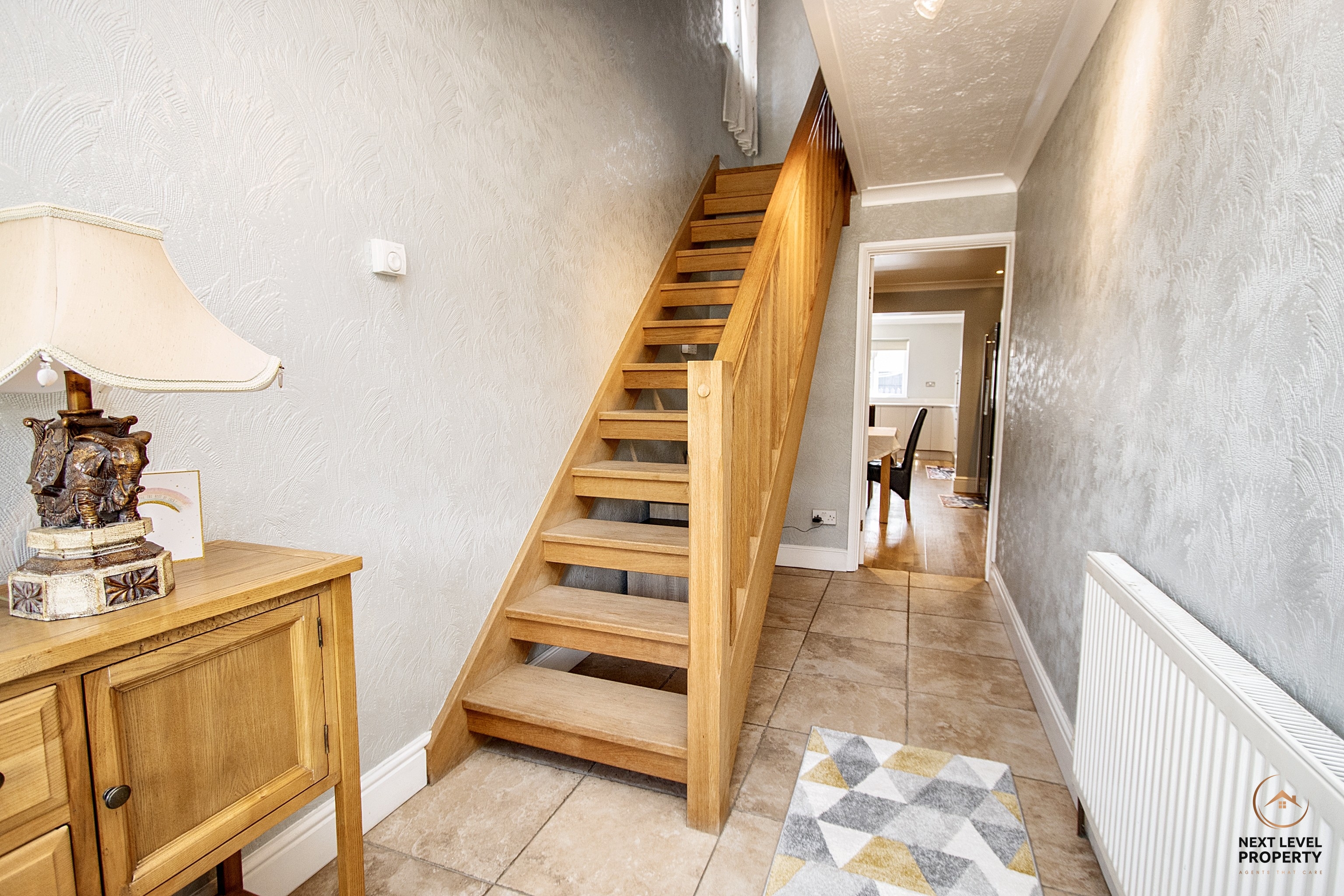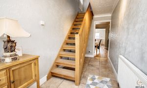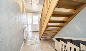 Oak staircase to the first floor, tiled floor, radiator and a glazed door that leads into the breakfast room