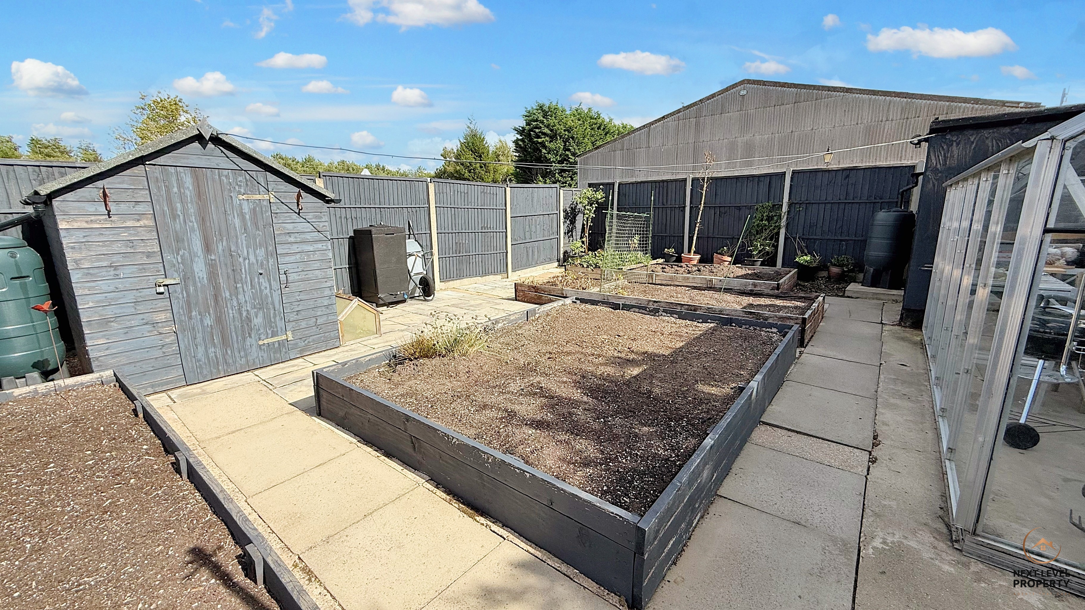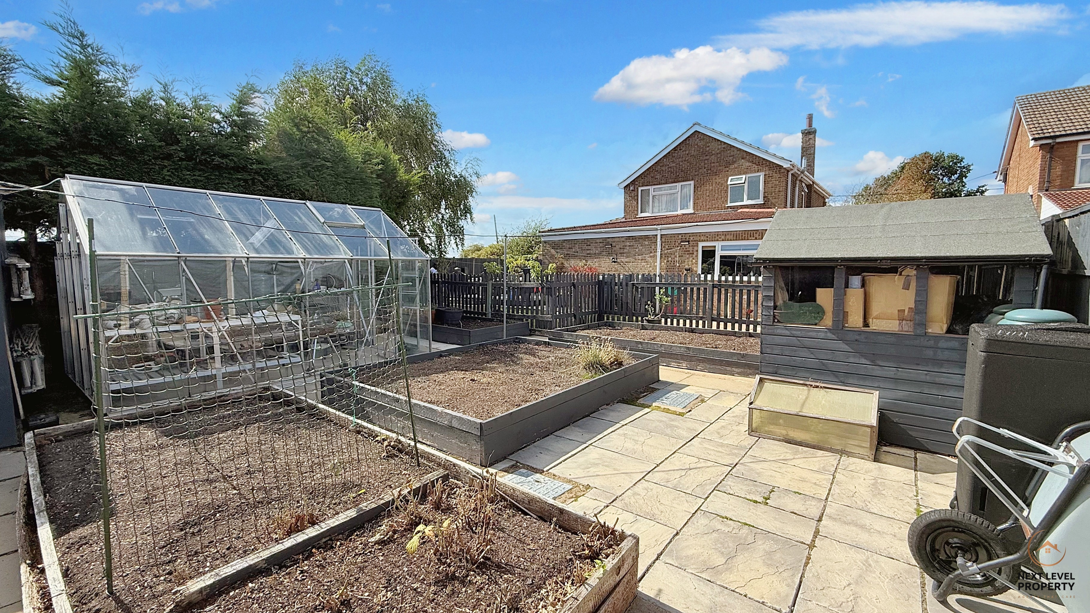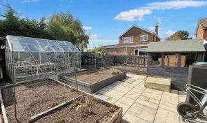 A raised decked terrace, directly accessed from the sitting room, is perfect for summer barbecues and evening drinks, while steps flow down to a broad lawn ideal for family play or quiet moments in the sun. Beyond, a patio opens onto a dedicated growing area with raised beds, greenhouse, and garden shed – the perfect setup for keen gardeners.