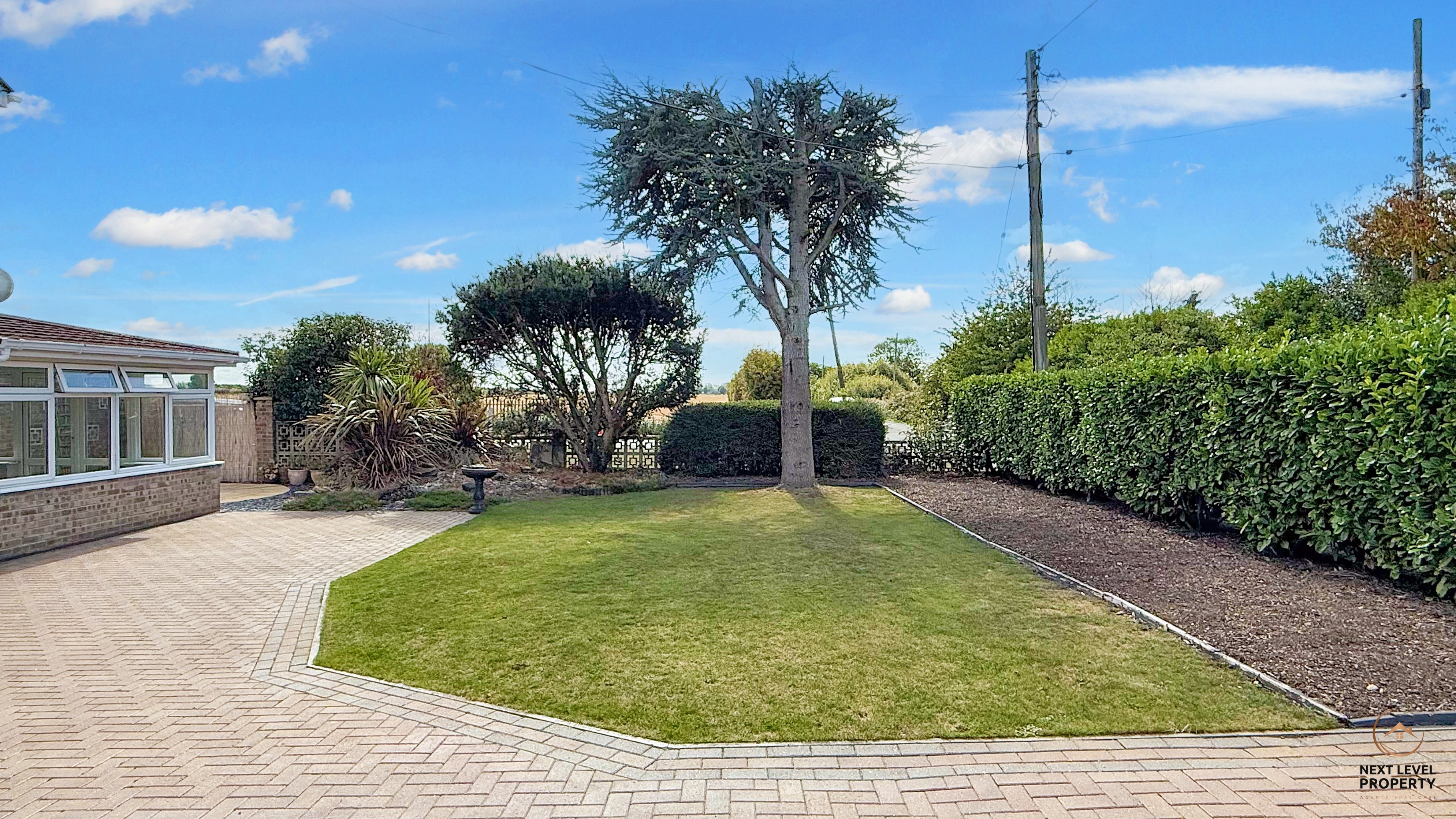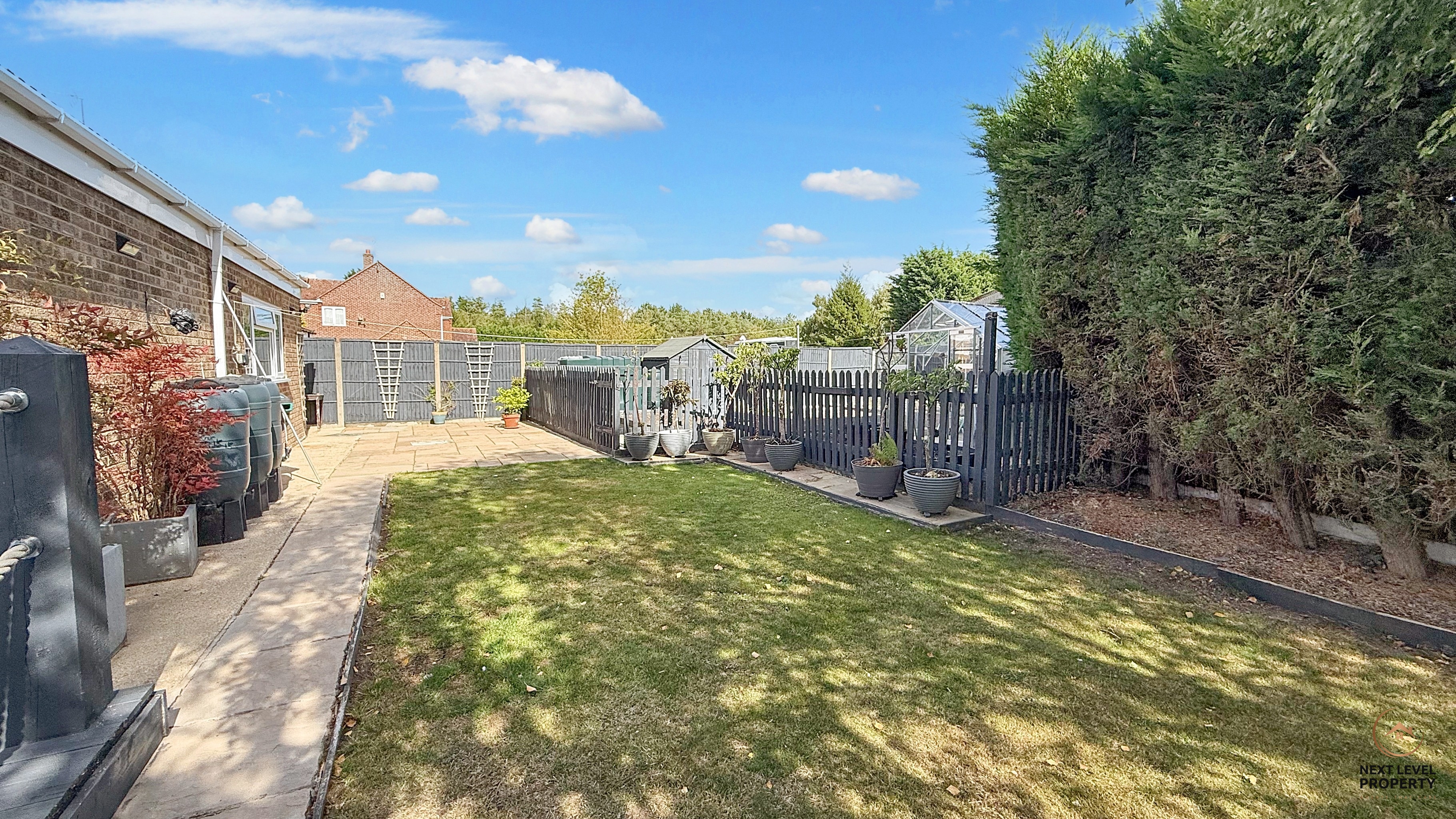Outside, the property continues to delight. A block-paved driveway at the front offers generous parking for several vehicles – with plenty of space for a caravan or motorhome – framed by neat lawns and colourful planting. A gated path leads around to the rear, where the garden has been cleverly landscaped to create distinct spaces for both relaxation and productivity.