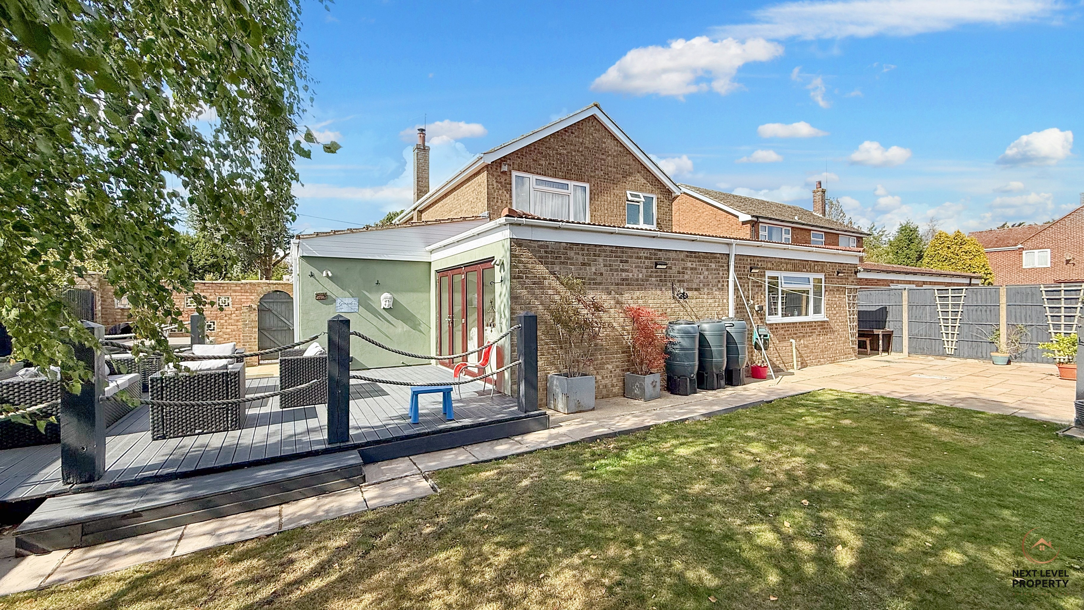 - Enclosed rear garden with raised decking, lawn and veg growing area