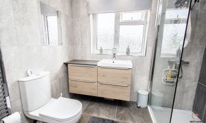 A luxury fully tiled shower room that has a large walk-in shower, a hand basin that is set to a vanity unit, heated towel rail and a low level WC. A uPVC double glazed window overlooks the rear.