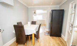 Wood effect laminate floor, ceiling spotlights, glazed door to the Lounge and an opening to the kitchen.