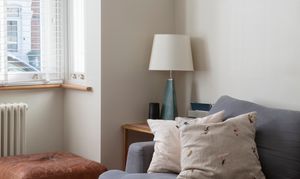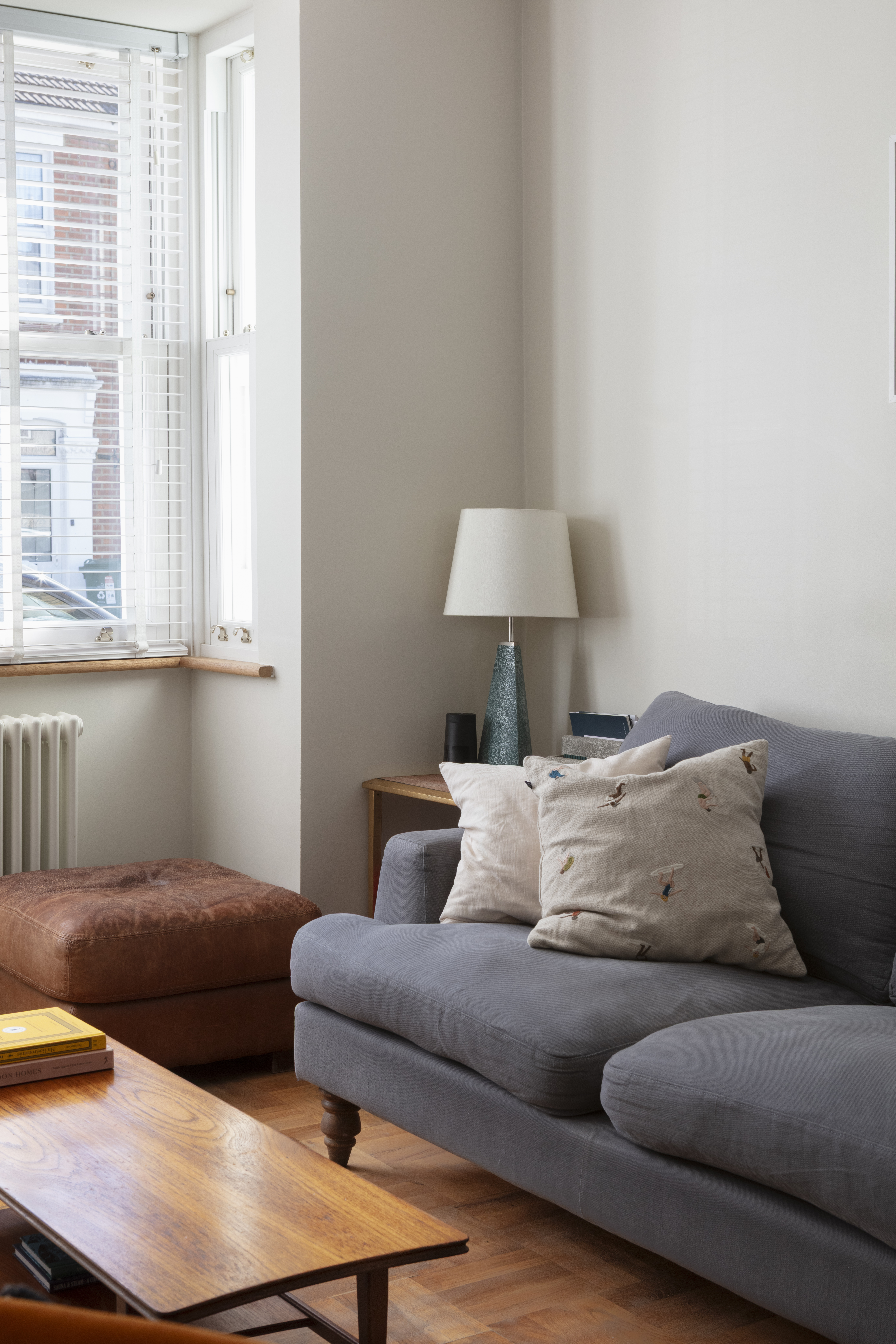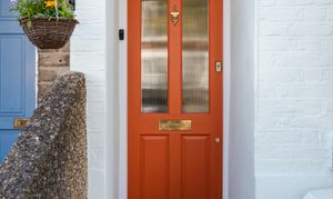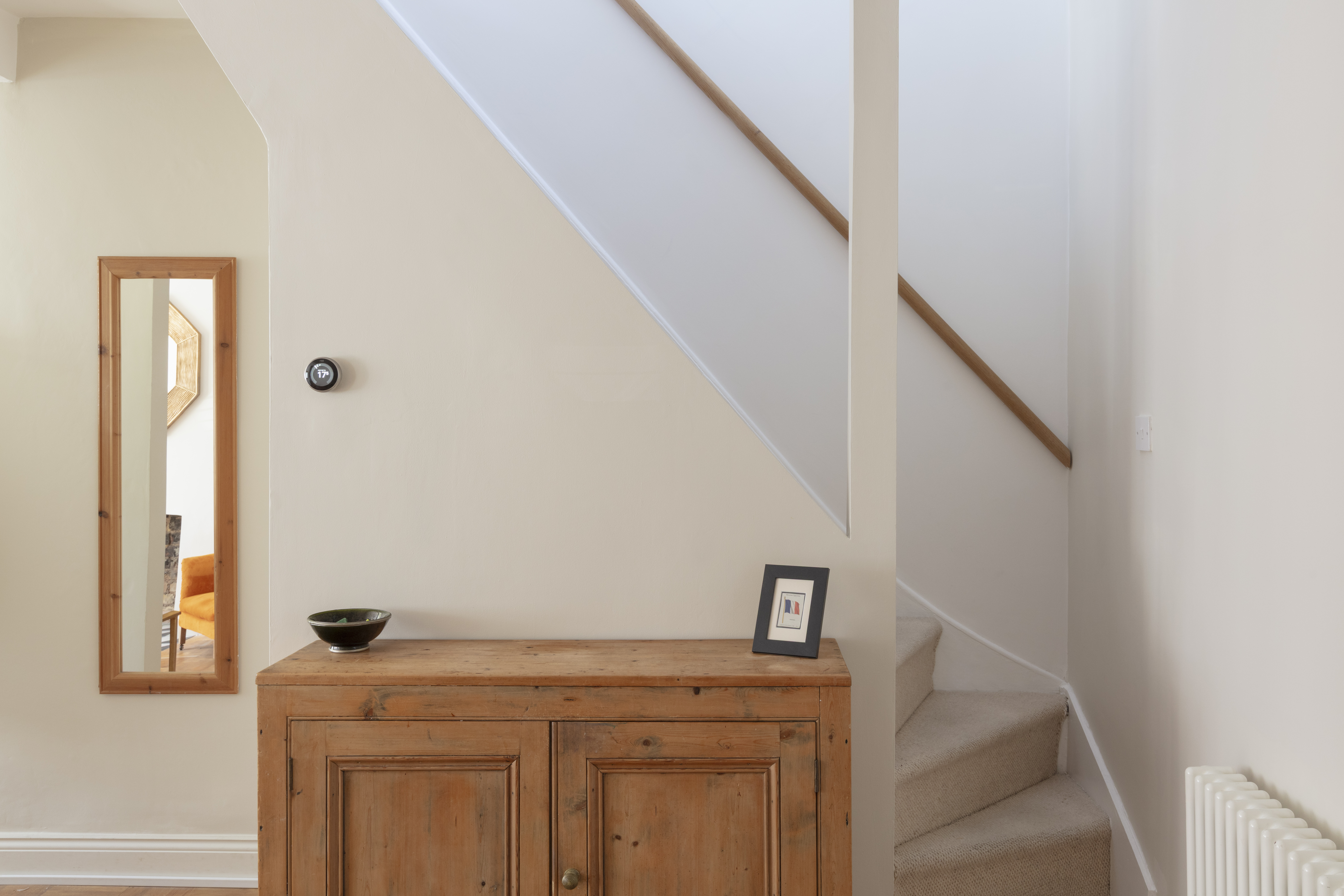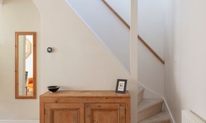 The house greets you with a painted brick exterior and a reeded-glass panelled door, painted in ‘Charlotte's Locks’ by Farrow & Ball and fitted with brass door furniture. The welcoming entrance hall has a traditional-style three-column radiator, a glass globe pendant light, a handy understairs cupboard, and solid hardwood flooring laid in a basketweave pattern.