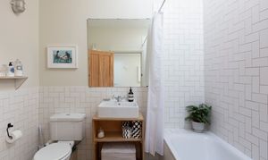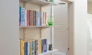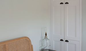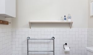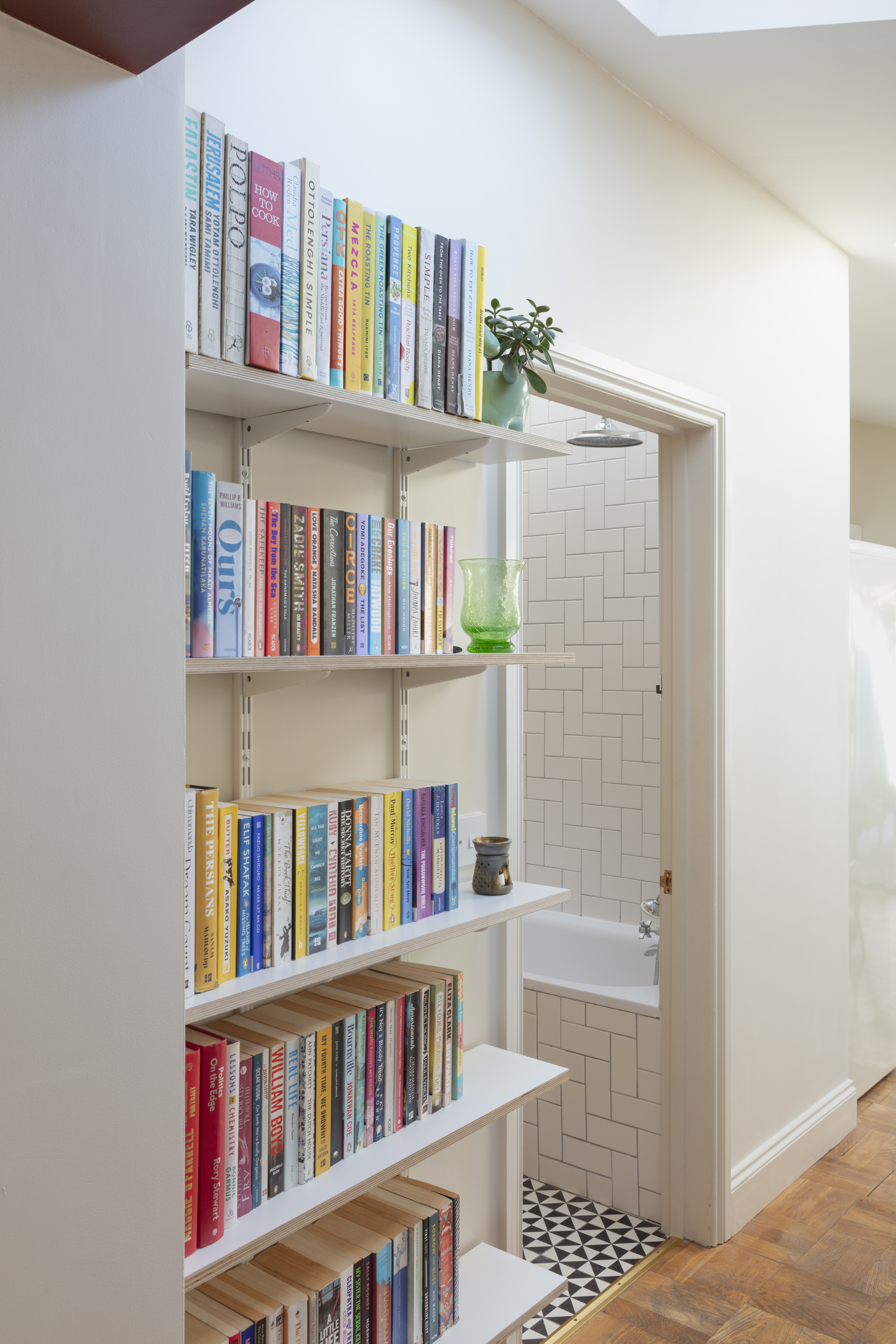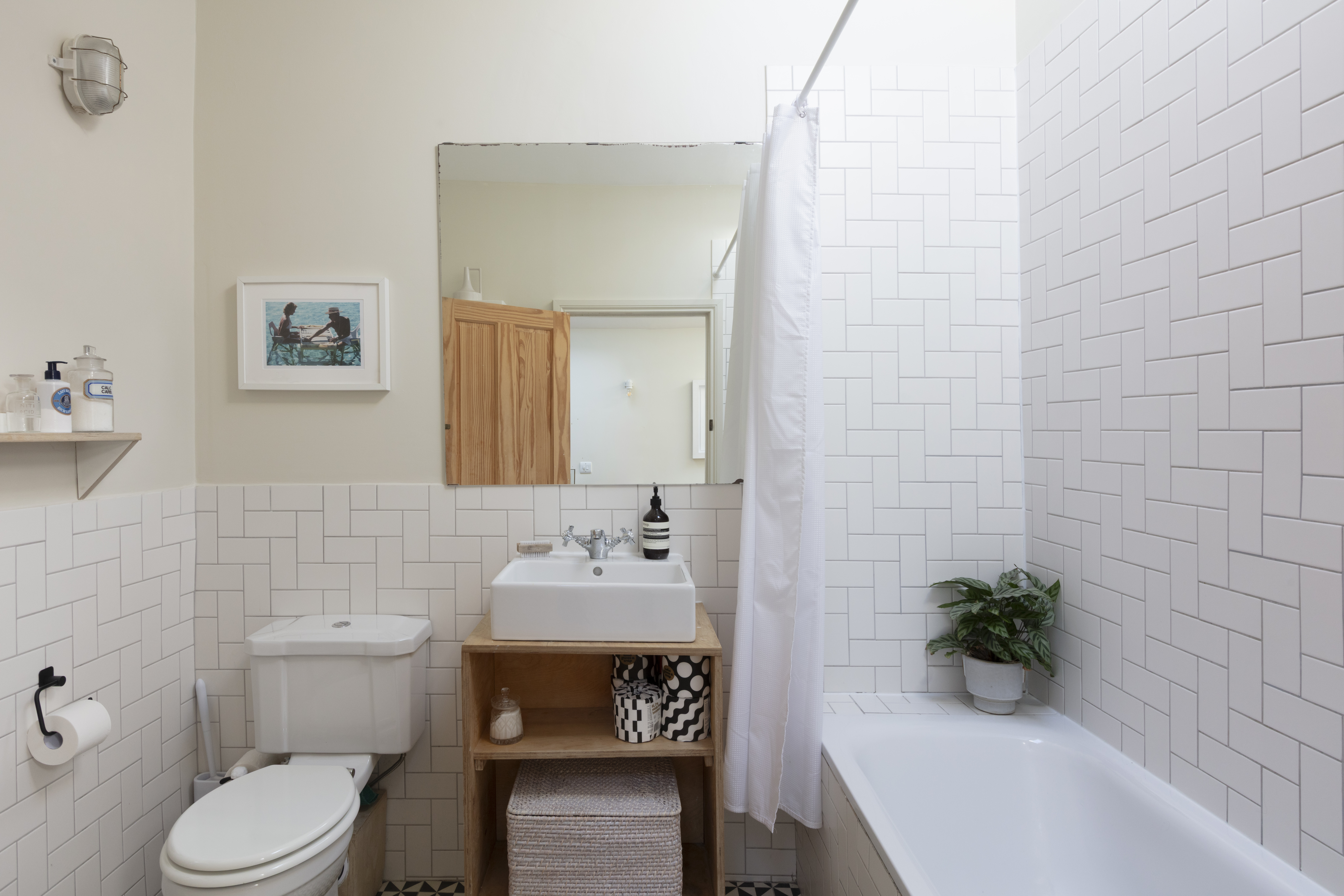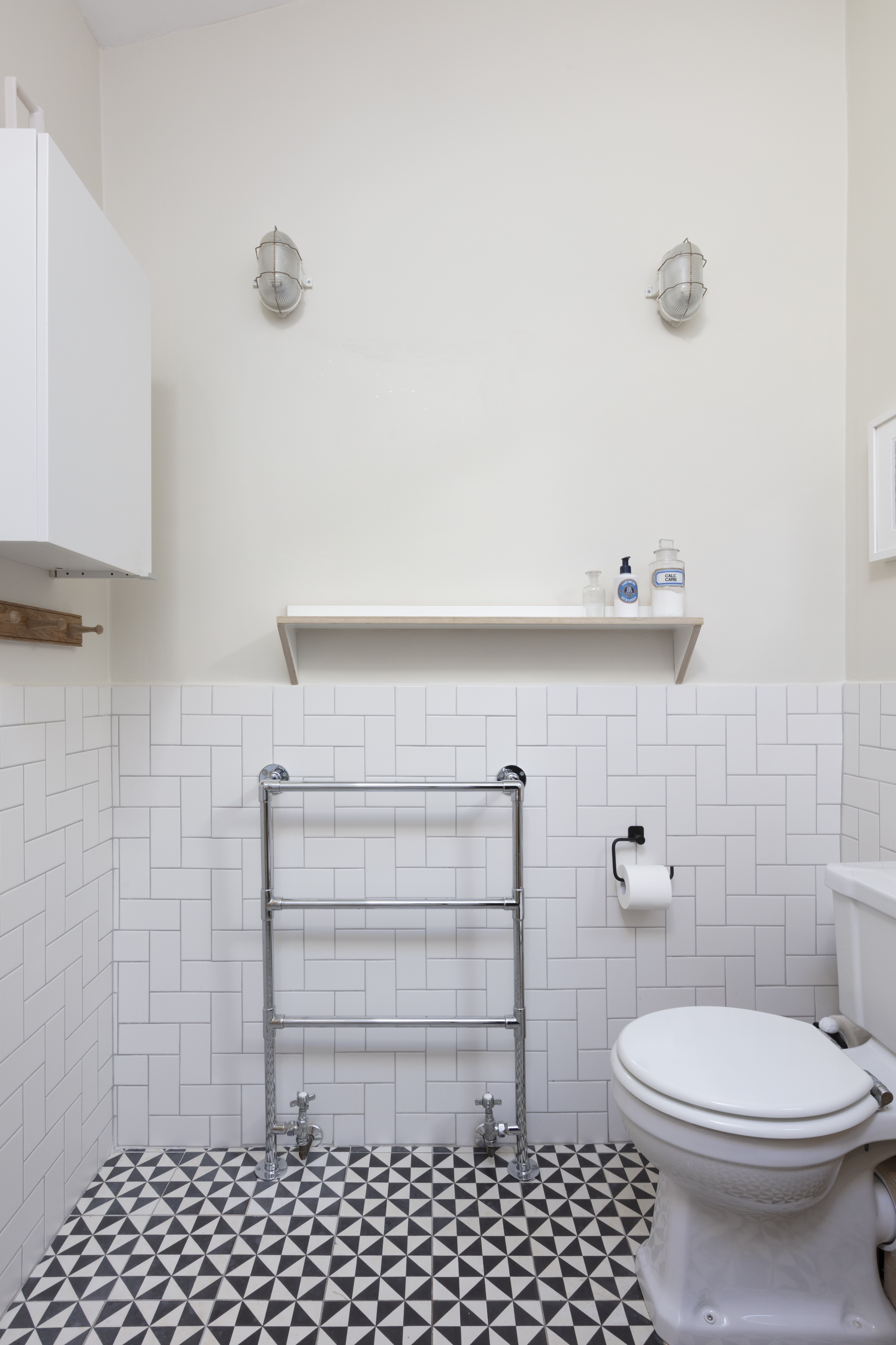 As you enter the extension to the left, you'll find a bathroom full of details. Matt white metro tiles laid in herringbone formation; a ceramic sink with birch ply vanity; bulkhead wall lamps; geometric monochrome floor tiles, and a large wall mirror are all part of the understated design. The floor-standing chrome towel rail radiator mirrors the traditional crosshead sink and bath taps, plus there's a fitted tropical shower as well as a handheld shower attachment and a close-coupled loo. Above, a Velux window in the high sloping ceiling bathes the room in light while maintaining perfect privacy.