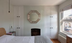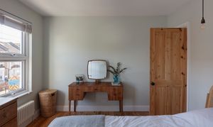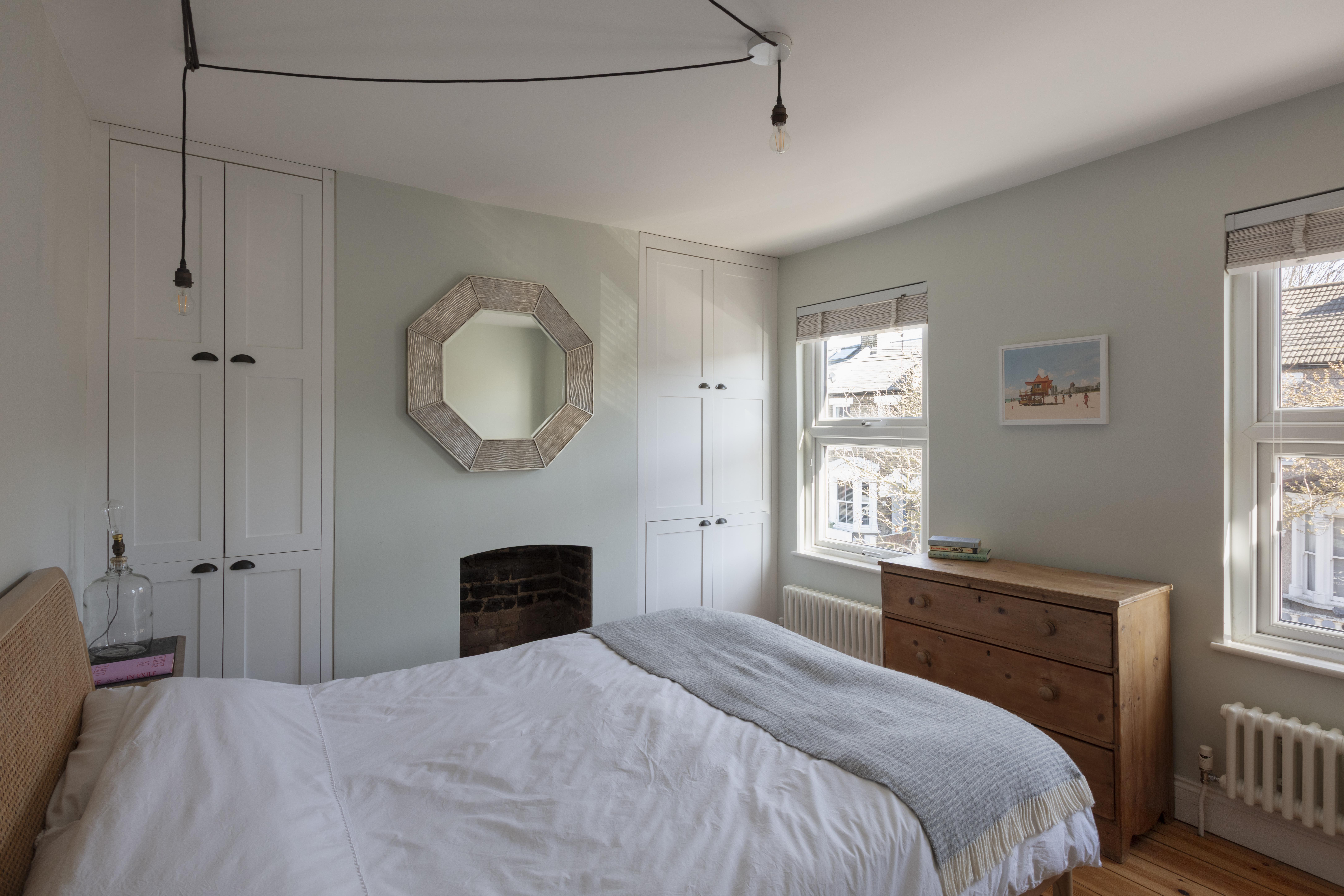 Running across the full width of the house, the main bedroom has two casement windows, each with custom Venetian blinds and a column radiator below. The airy, restful Scandi decor continues here with Farrow & Ball ‘Pale Powder’ walls, an exposed brick fireplace and Bert & May tiled hearth – to match the one downstairs – and a contemporary exposed bulb pendant fitting above the bed. Fitted floor-to-ceiling alcove storage provide ample space for two.