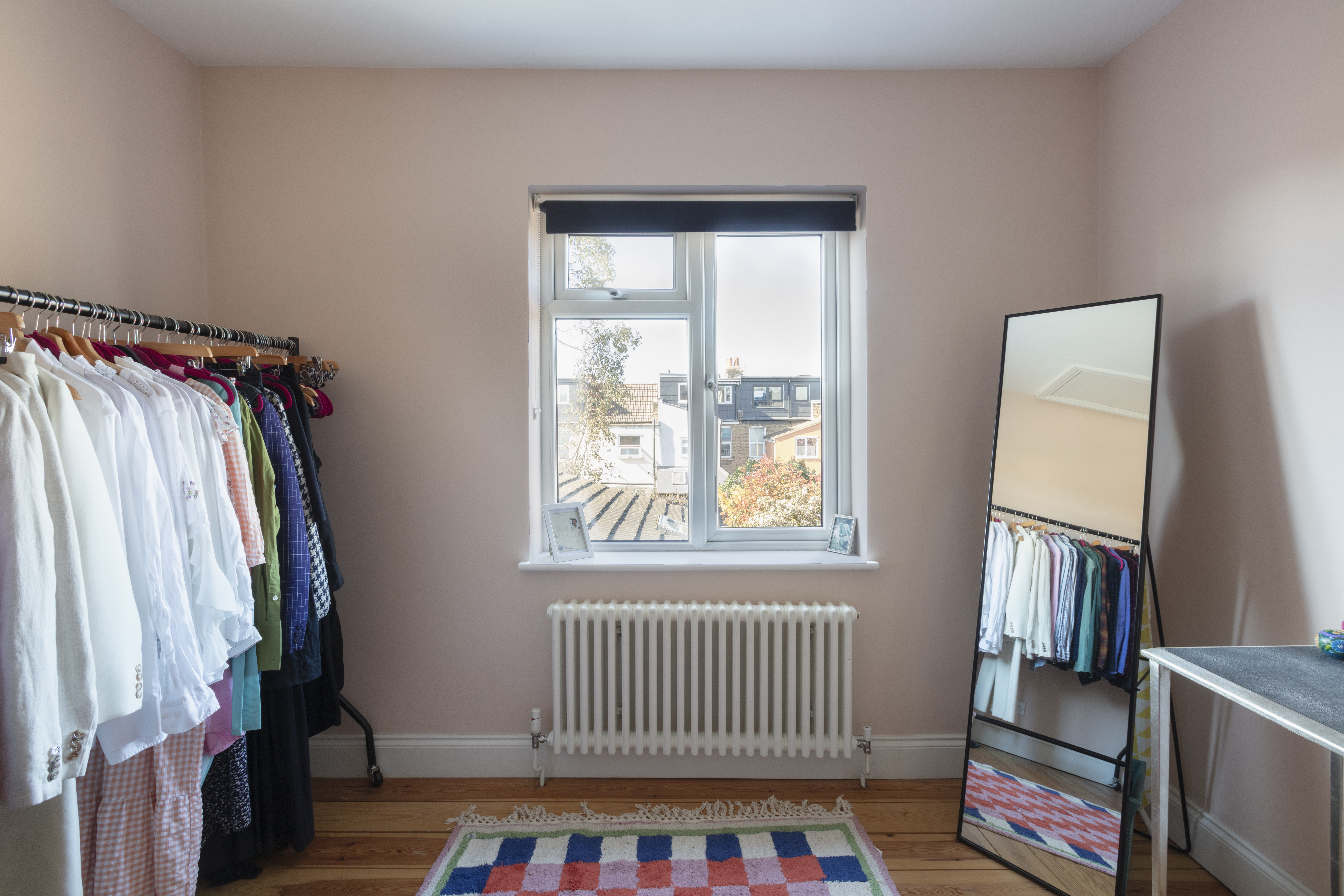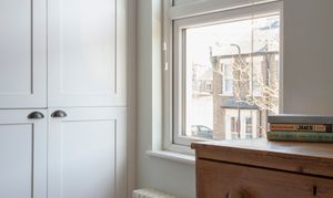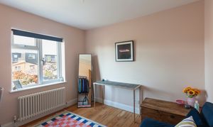 In the second bedroom, the large window and Farrow & Ball ‘Pink Ground’ walls ensure a bright and welcoming feel, while a ceiling hatch allows access to the boarded loft via an ingenious unfurling wooden staircase. Subject to the necessary consents, the roof space provides a great opportunity for an extra bedroom or study.