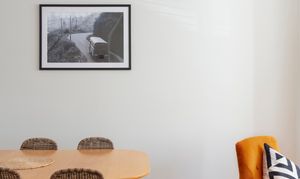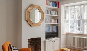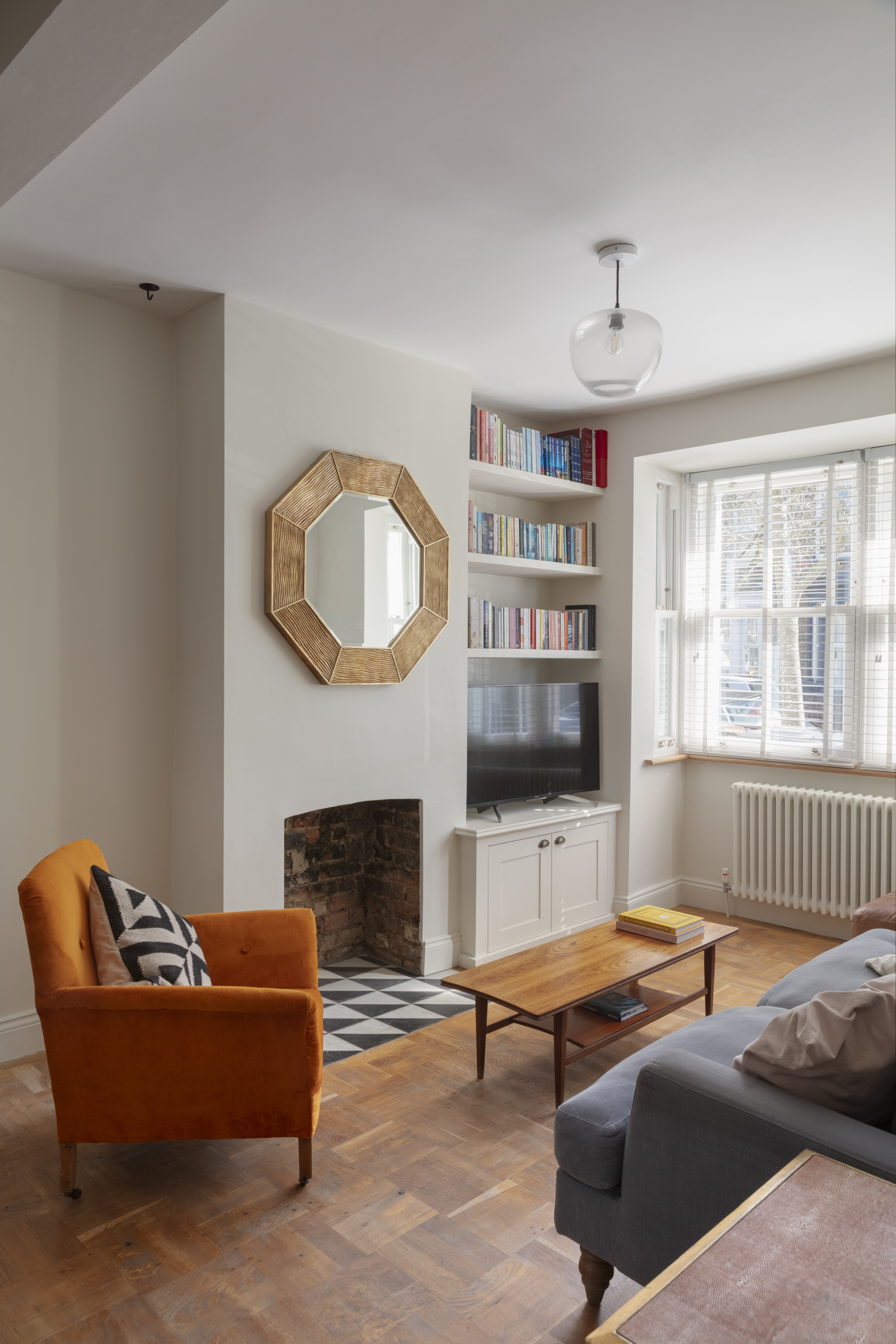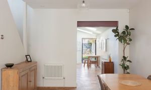 The flooring continues into the twin light-filled living areas that benefit from a large bay to the front, glazed with uPVC woodgrain sash windows and fitted with Venetian blinds. An exposed-brick fireplace with a geometric Bert & May tiled hearth contrasts with walls painted in Farrow & Ball's iconic ‘School House White’ and recessed floating shelves above a shaker-style fitted TV unit. The dining area at the rear has an open-sided staircase to let in even more light from a strategically placed first-floor window.