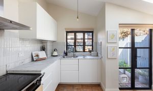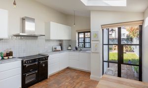 Through to the kitchen, black Crittall-style steel windows and French doors pair with a trio of large Velux windows and a high sloping ceiling to give an impressive feeling of space. The wood flooring is complemented by handleless white units, a bespoke Italian marble worktop, and a white Bert & May tiled splashback. There’s an integrated Electrolux dishwasher and room for a laundry appliance, a fridge-freezer and a range oven under the stainless-steel NEFF triple-filter extractor hood. Fully serviced and with parts replaced in 2026, the Ideal boiler is connected to a Nest smart learning thermostat for a perfect temperature all year round.