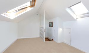 On the first floor landing there is access via a pull-down ladder/staircase to a sizable loft room, which is an additionally bright room with Velux windows to the front and rear. The good size master bedroom overlooks the front of the house towards the water, whilst bedroom two, also a double room, enjoys views over the pretty rear garden. The bathroom, which was updated several years ago, has a panelled bath, separate shower cubicle and wash hand basin set into a vanity unit with cupboards below, along with a WC and airing cupboard to one side of the room.
