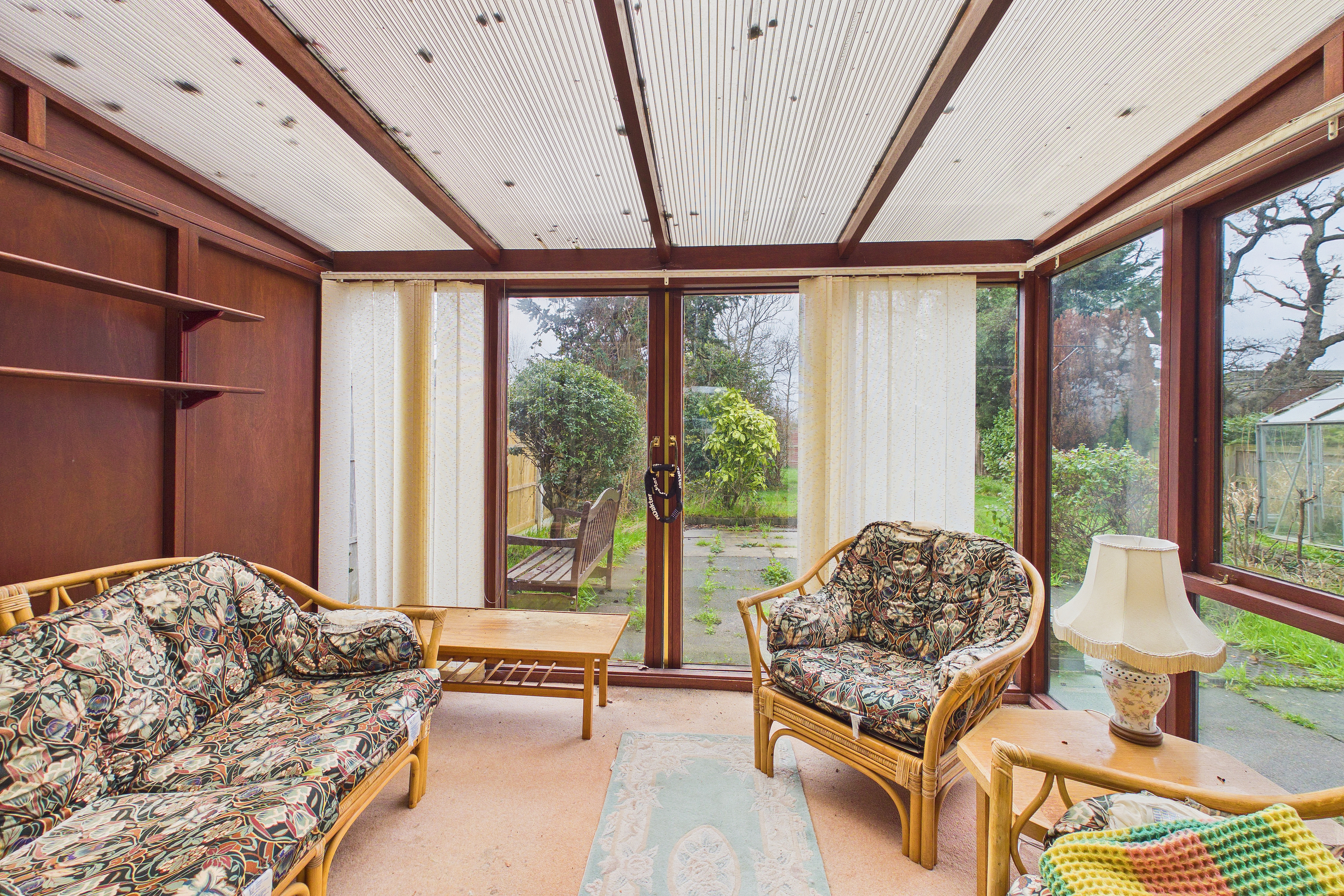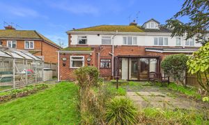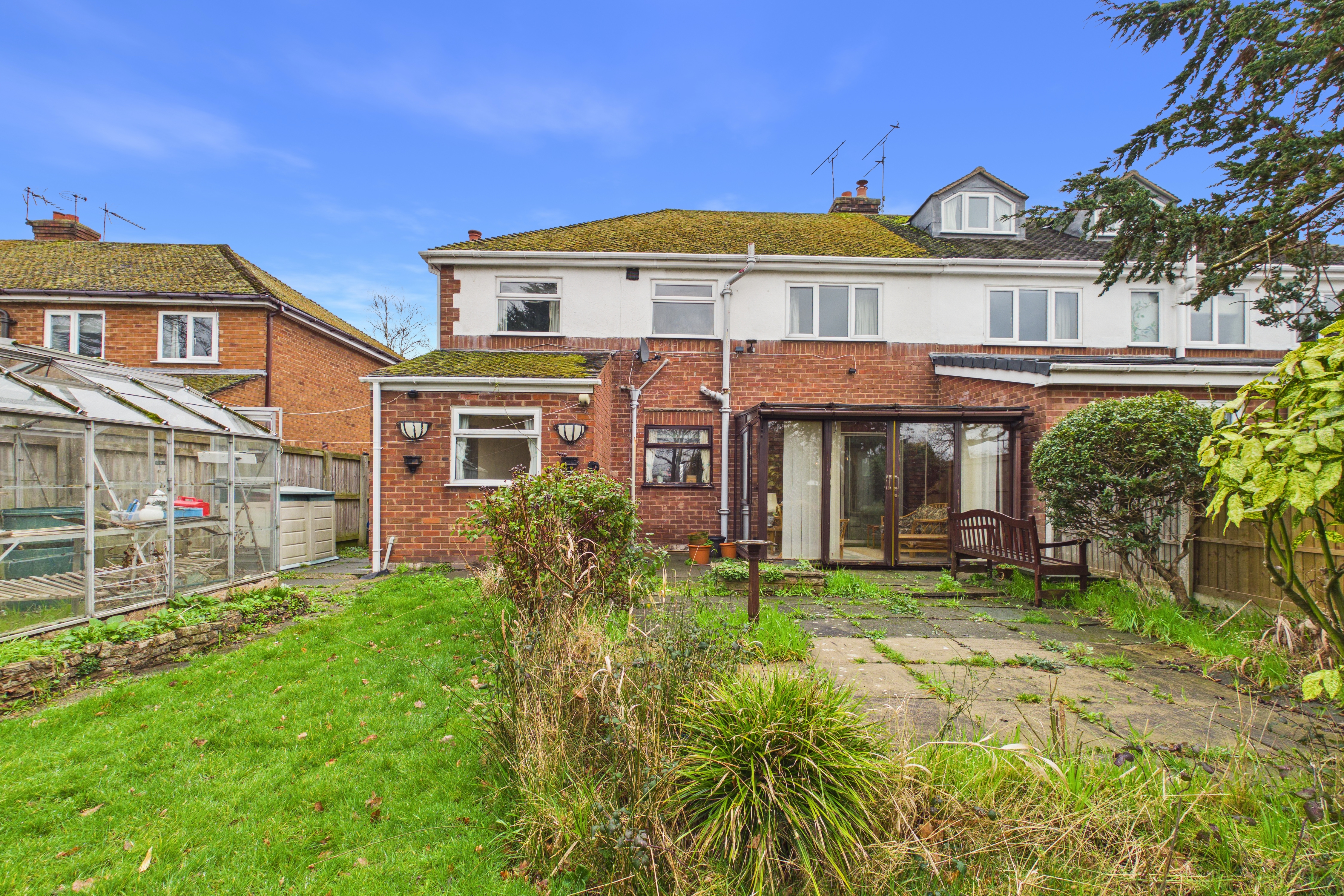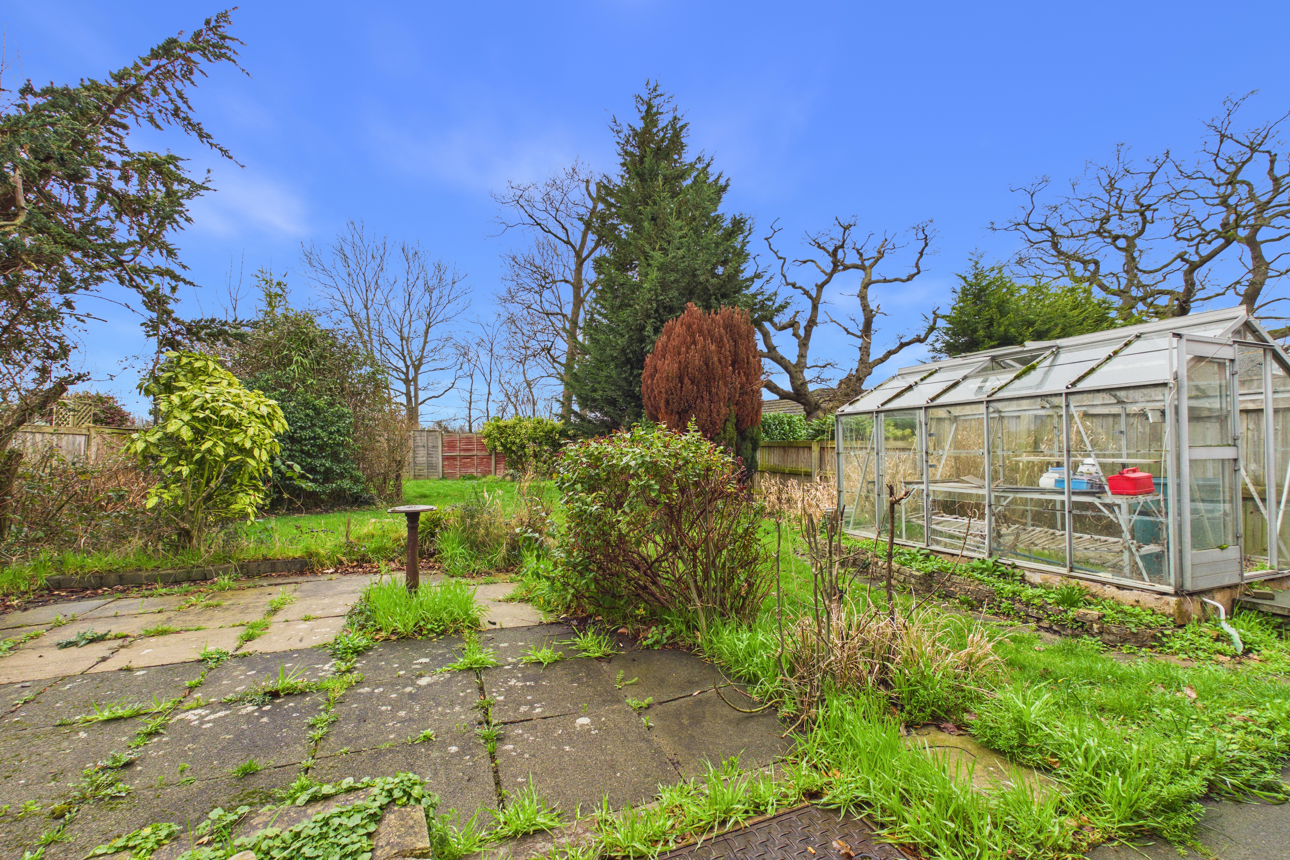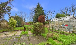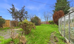 Of good size and largely a blank canvas, the rear garden offers excellent potential for keen gardeners, while already featuring a patio area, greenhouse, and a predominantly lawned layout, all well enclosed by fencing and mature shrub borders.