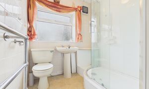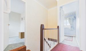 To the first-floor landing, access is provided to all four bedrooms, three of which benefit from built-in wardrobe storage. The bedrooms are served by a shower room featuring a three-piece suite, including a corner shower cubicle with sliding screen doors. There is also a useful airing cupboard located off the landing.