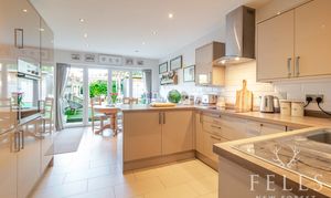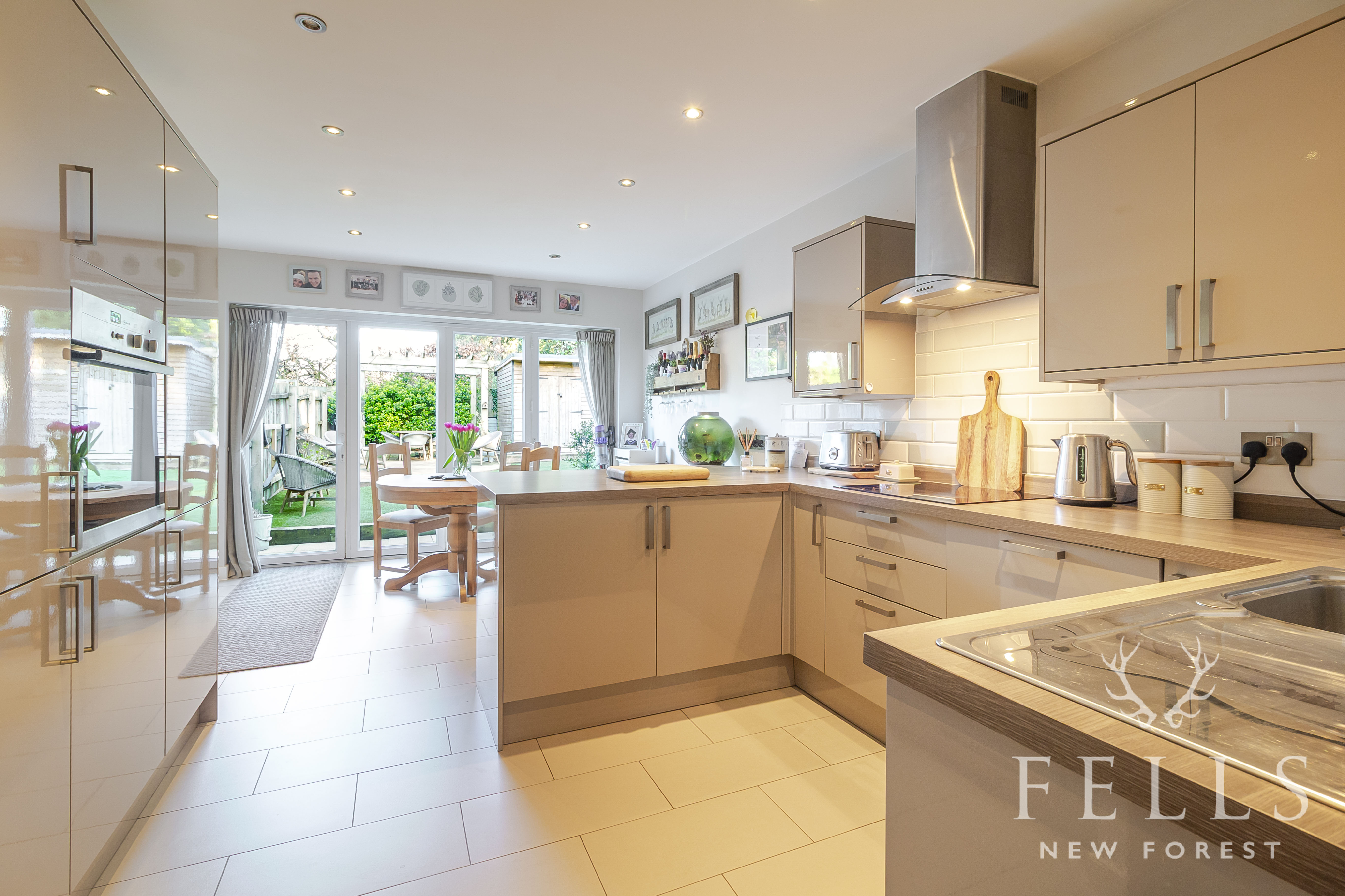 The rear of the home opens into a superb kitchen dining space, perfectly suited to modern lifestyles. Bifold doors span the back wall, drawing in light and opening directly onto the garden, making this an ideal setting for entertaining or simply enjoying the changing seasons. The kitchen is sleek and functional, with integrated appliances and ample storage, while a cleverly designed utility cupboard keeps laundry appliances neatly tucked away. There is generous space for a dining table, creating a natural hub for everyday life.