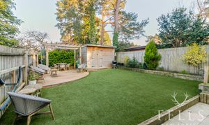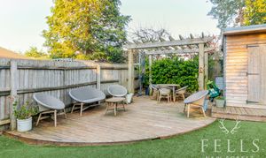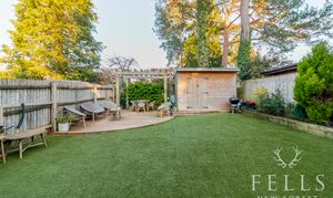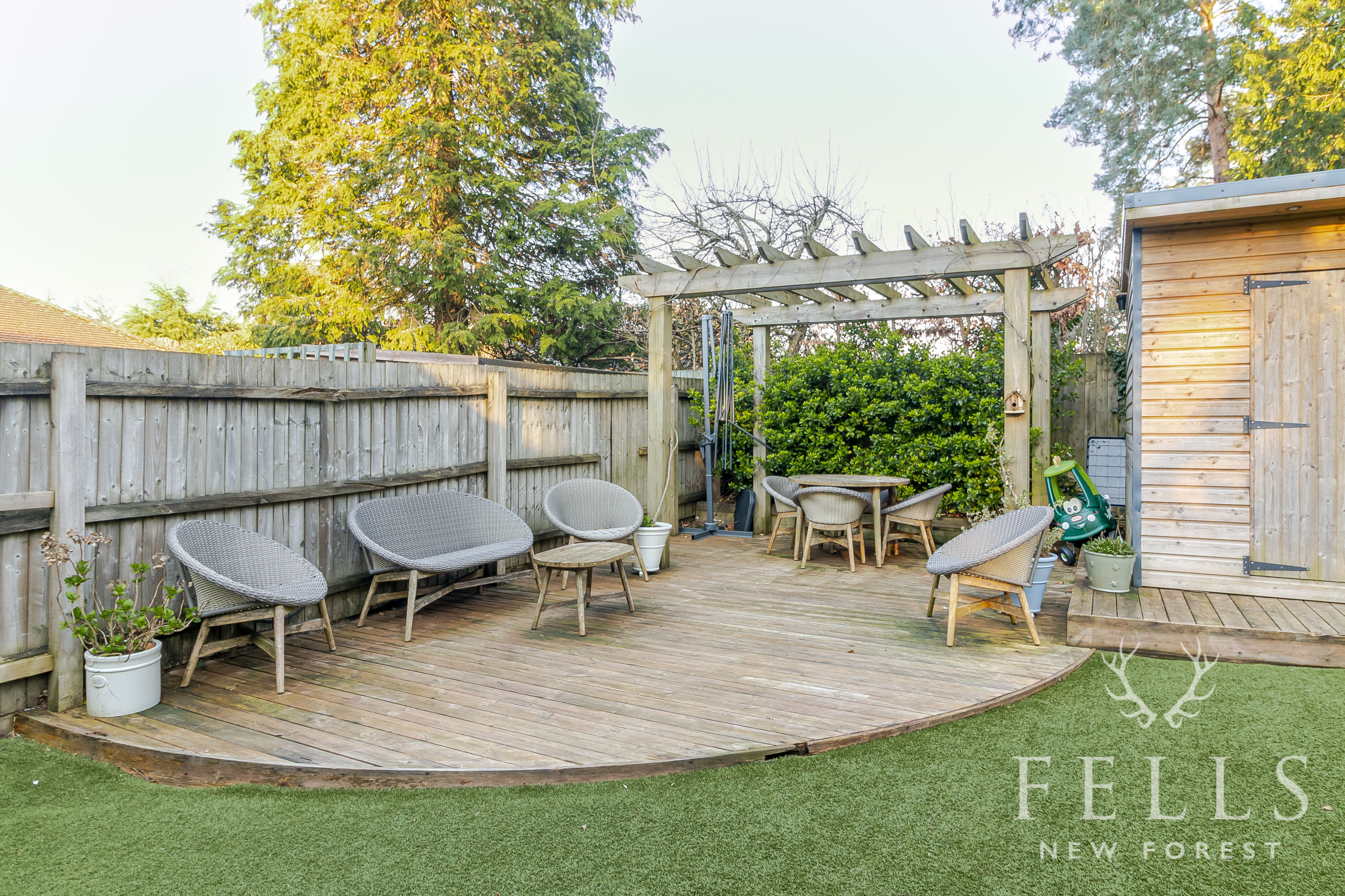 Outside, the garden has been thoughtfully arranged to offer both ease of maintenance and space to unwind. A paved terrace sits alongside the house and wraps to the side, ideal for outdoor dining. Steps rise to an area of artificial lawn, while a decked seating area beneath a pergola provides a more private spot for entertaining. A timber shed sits neatly to one corner, and side access connects the front and rear.