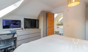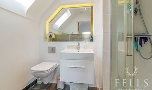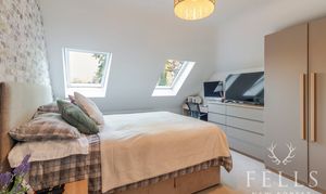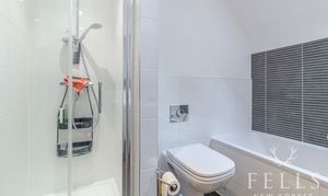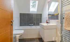 Upstairs, the accommodation continues to impress. The principal bedroom sits to the rear and benefits from twin skylights that bring in soft natural light, along with a well appointed ensuite shower room. A second double bedroom is positioned at the front, while the third bedroom works equally well as a comfortable single room, nursery or home office depending on your needs. The family bathroom is finished to a high standard, complete with both bath and separate shower.