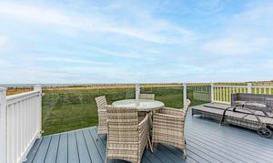 Seamlessly blending indoor and outdoor living, sliding doors open onto a generous decked terrace that overlooks the coast. Here, you can enjoy al-fresco dining, sip a glass of wine as the sun sets, or simply relax while listening to the soothing sound of the waves. To the side of the holiday home is off-road parking for two vehicles.