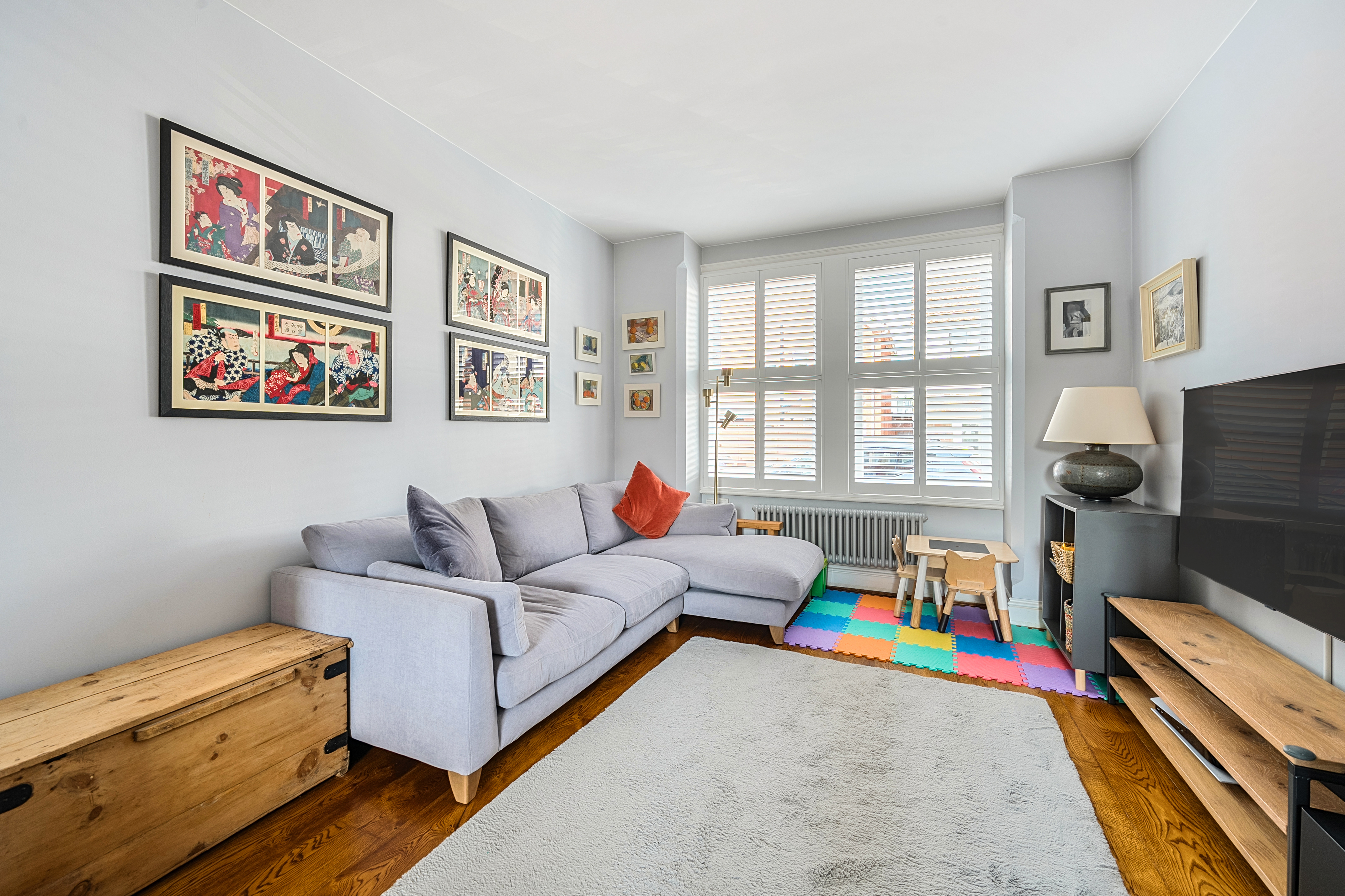 The ground floor has been thoughtfully designed for open plan living, featuring spacious living and dining areas that flow seamlessly from front to back. The dual-aspect living room benefits from elegant shutters, offering plenty of natural light while ensuring privacy. The dining area easily accommodates a family-sized dining table and is flooded with light from a large glass door which opens out to the side access and enhances the flow and sense of space.