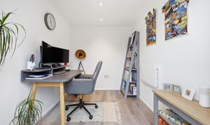 Externally, the property enjoys a good sized west facing rear garden with French doors opening into the home office. To the front, a driveway provides parking for two vehicles and leads to the garage, which retains storage space alongside the converted office area.
