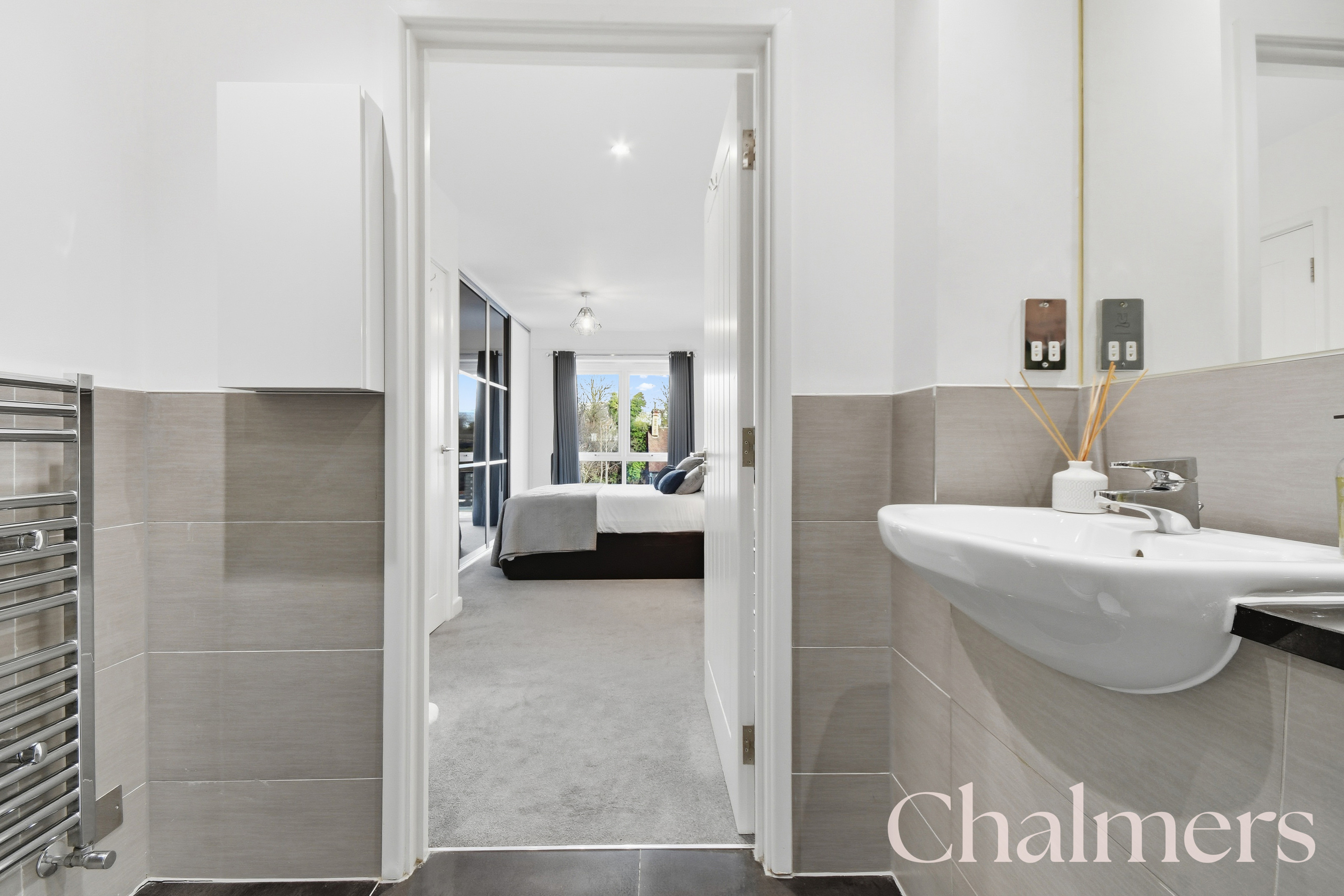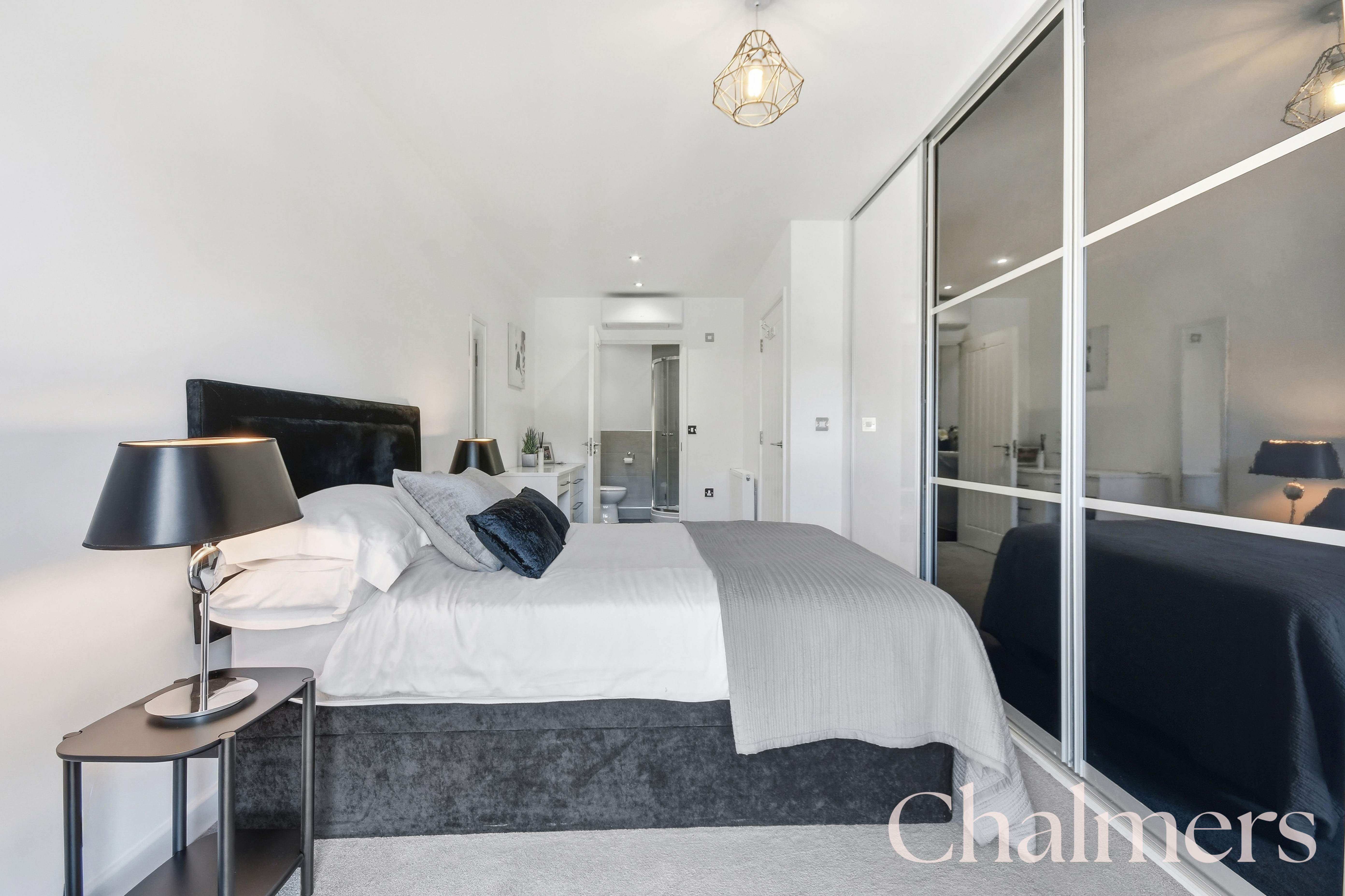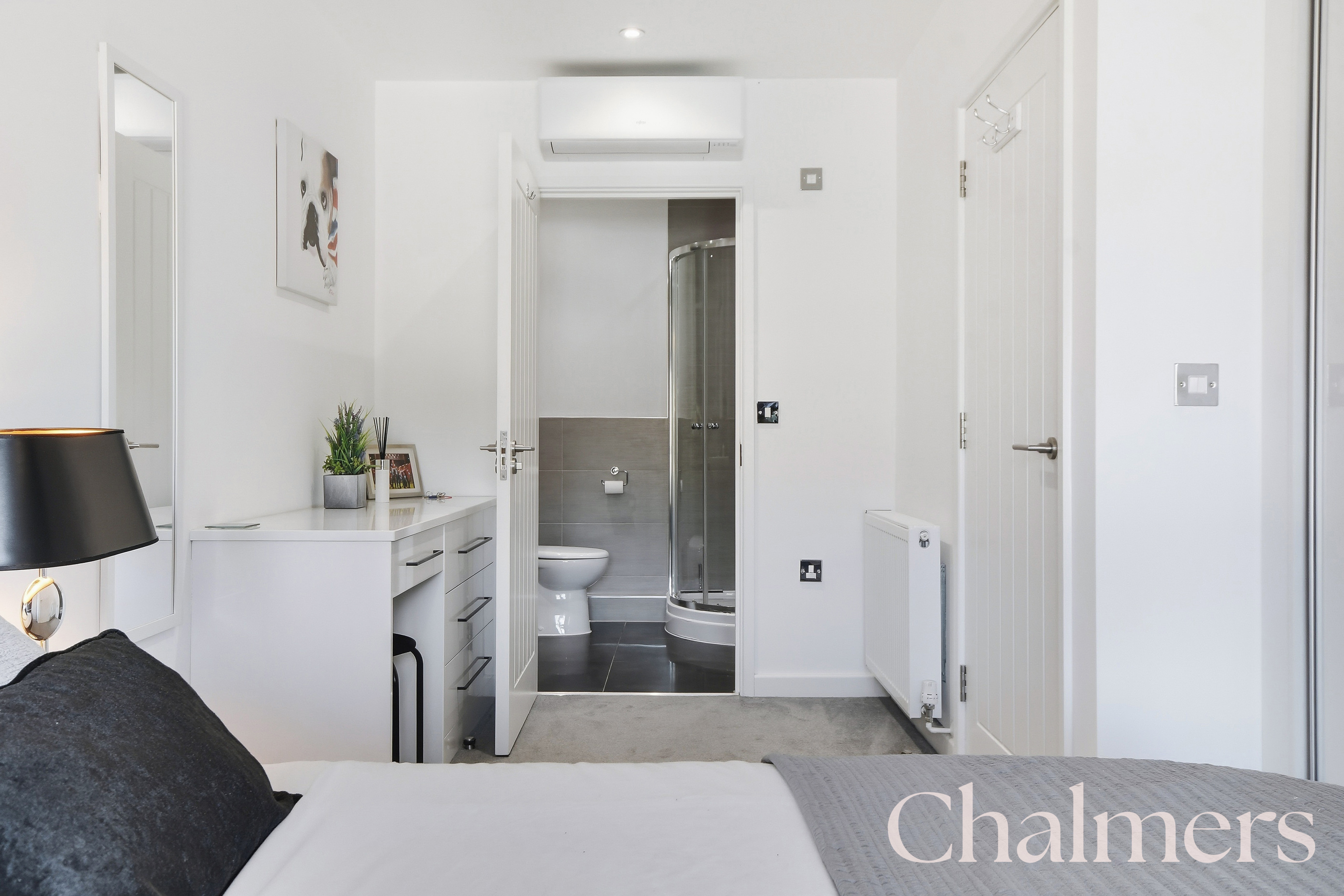 Bedroom One benefits from an air-conditioning unit and en-suite shower room with built-in basin, toilet, walk-in shower, chrome heated towel rail, and a large mirror that creates a spa-like feel.