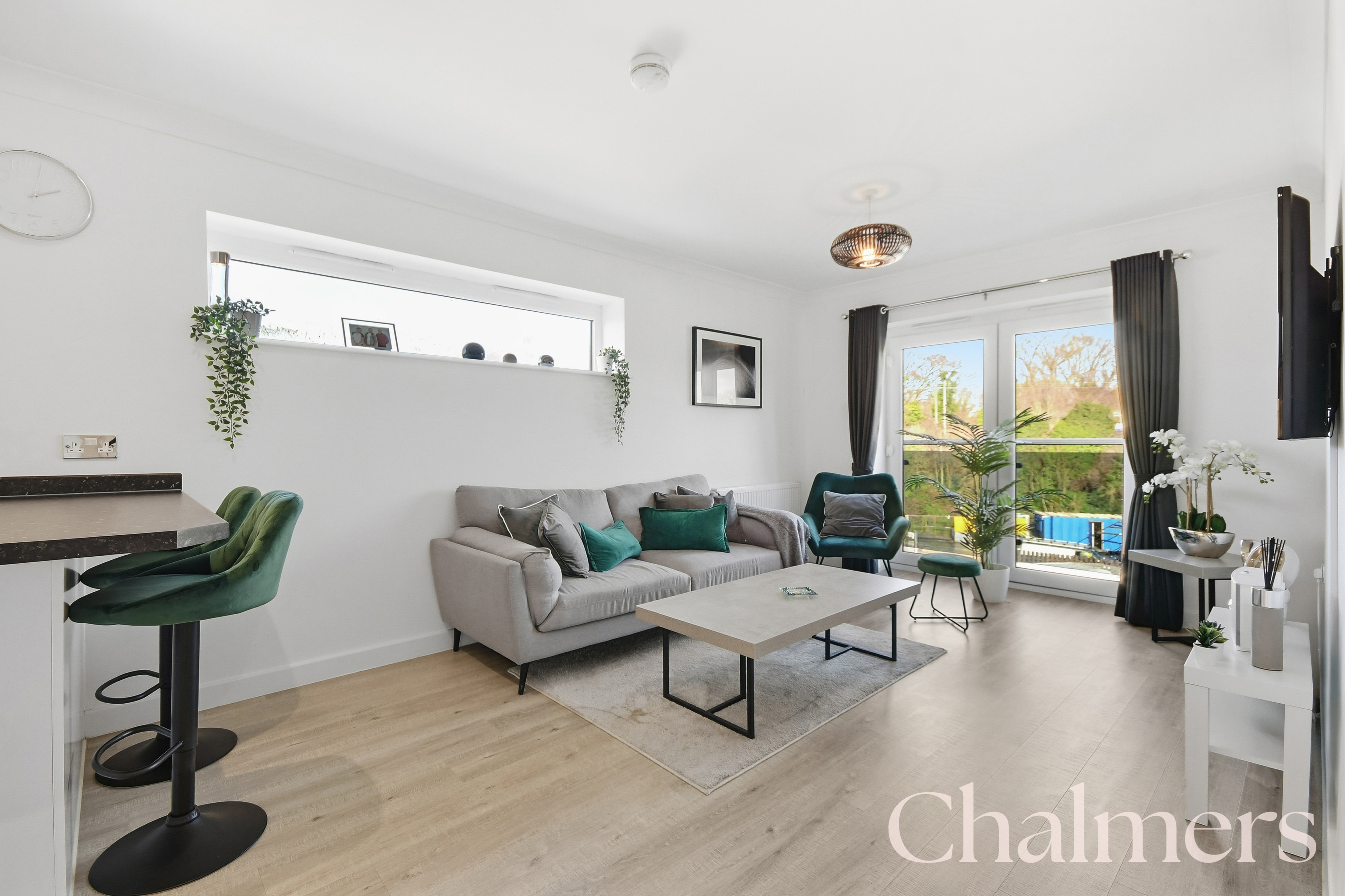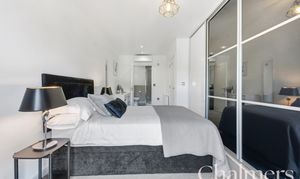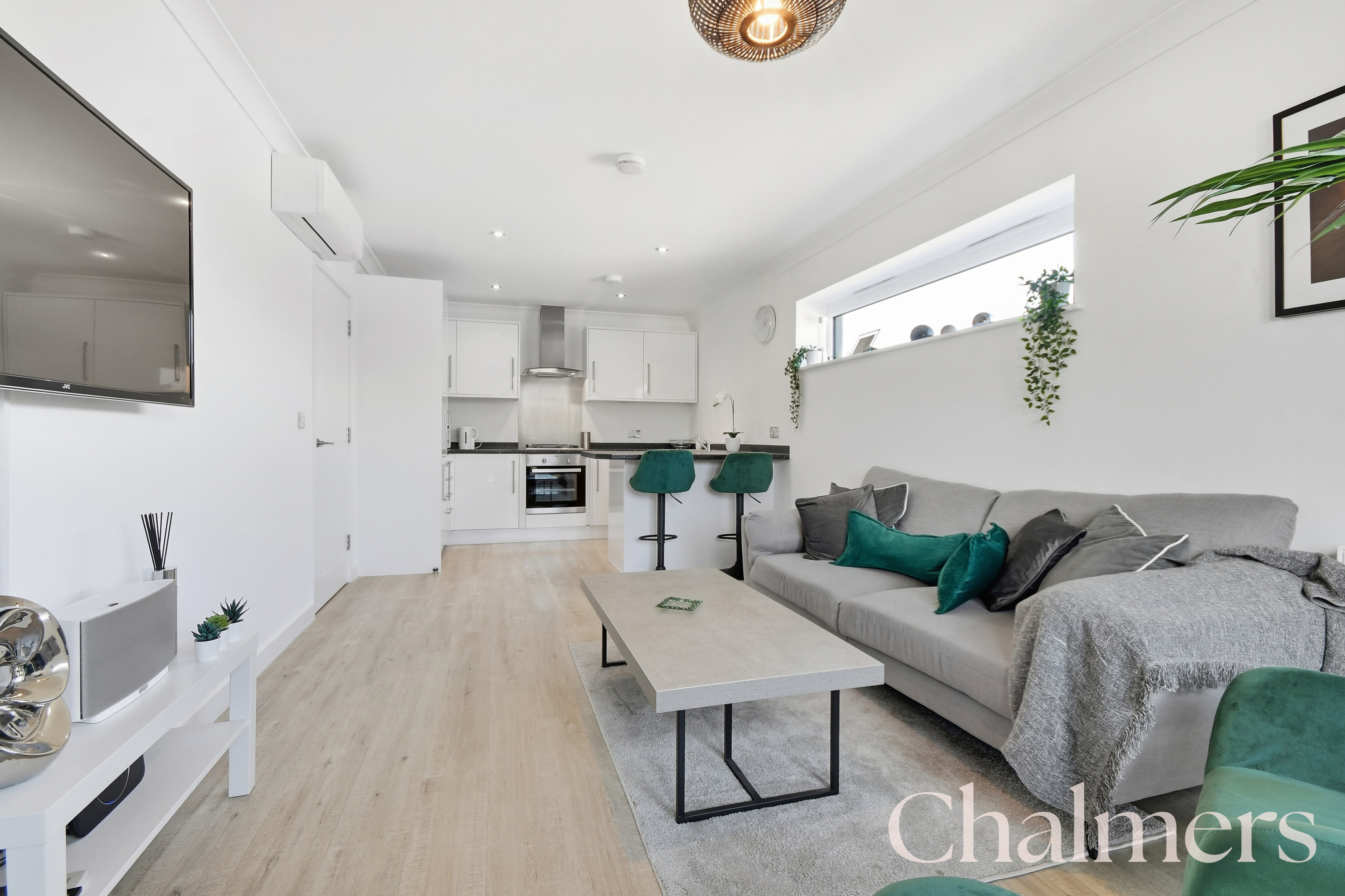 The spacious open plan kitchen/living area has a juliet balcony that floods the space with natural light, as well as a high level window to the side aspect. This space also has the added bonus of an air-conditioning unit. This room is perfect for relaxing or entertaining. The modern kitchen features sleek white units, integrated appliances and a breakfast bar, making it a fantastic spot for casual dining or hosting friends.