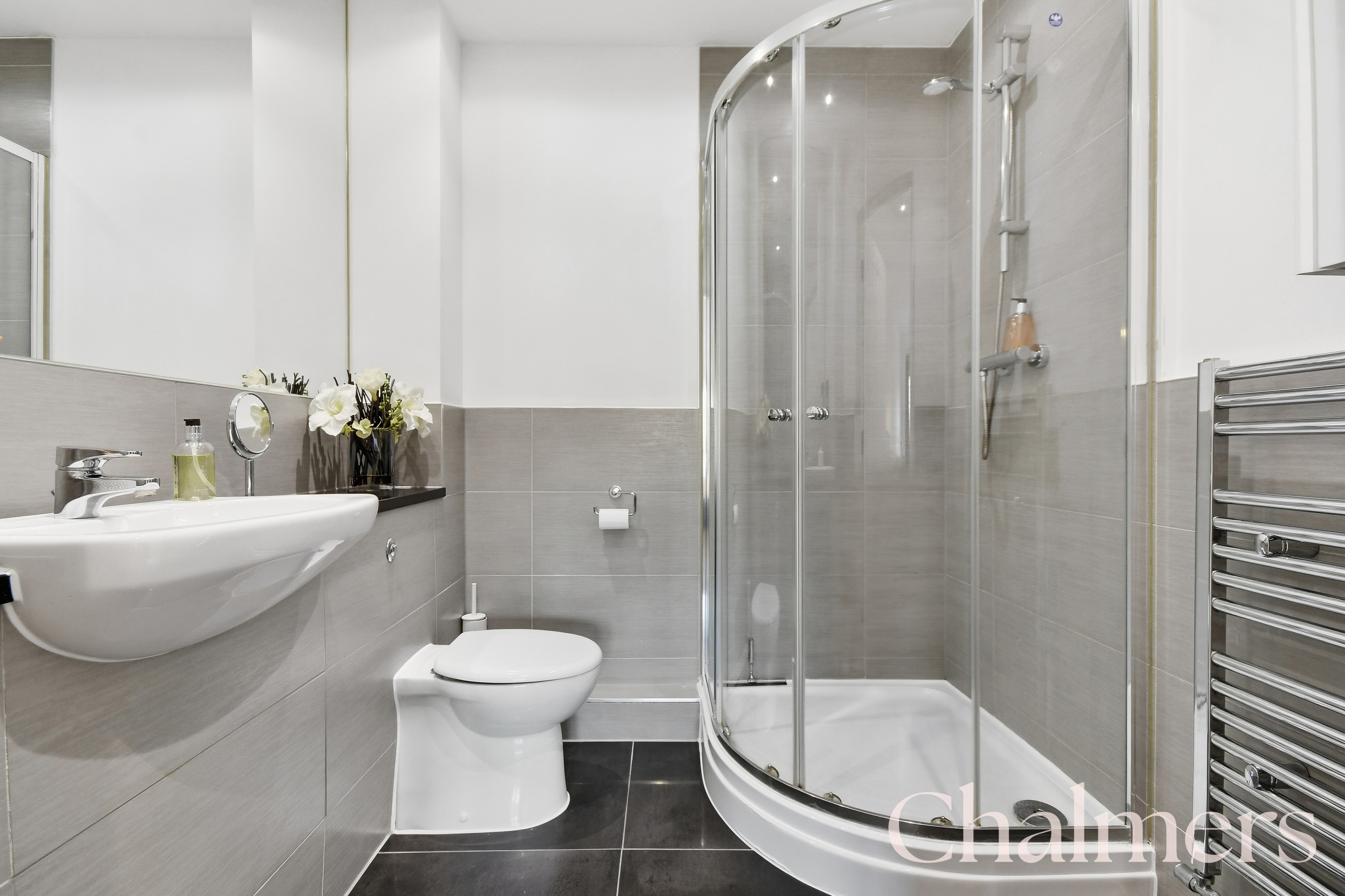 Large shower, basin, toilet and heated towel rail.