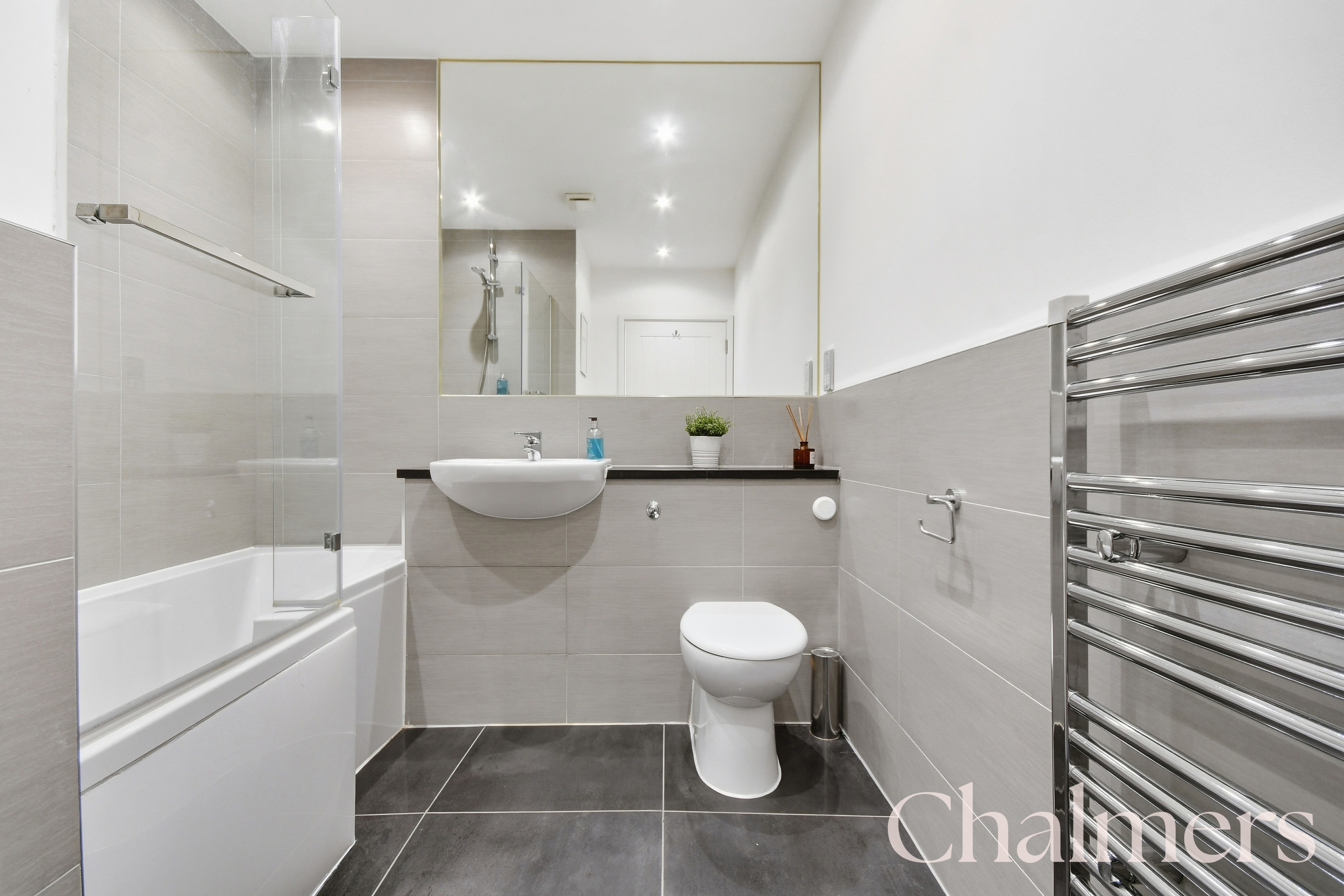 Bath with shower over, basin, toilet, large mirror and heated towel rail.