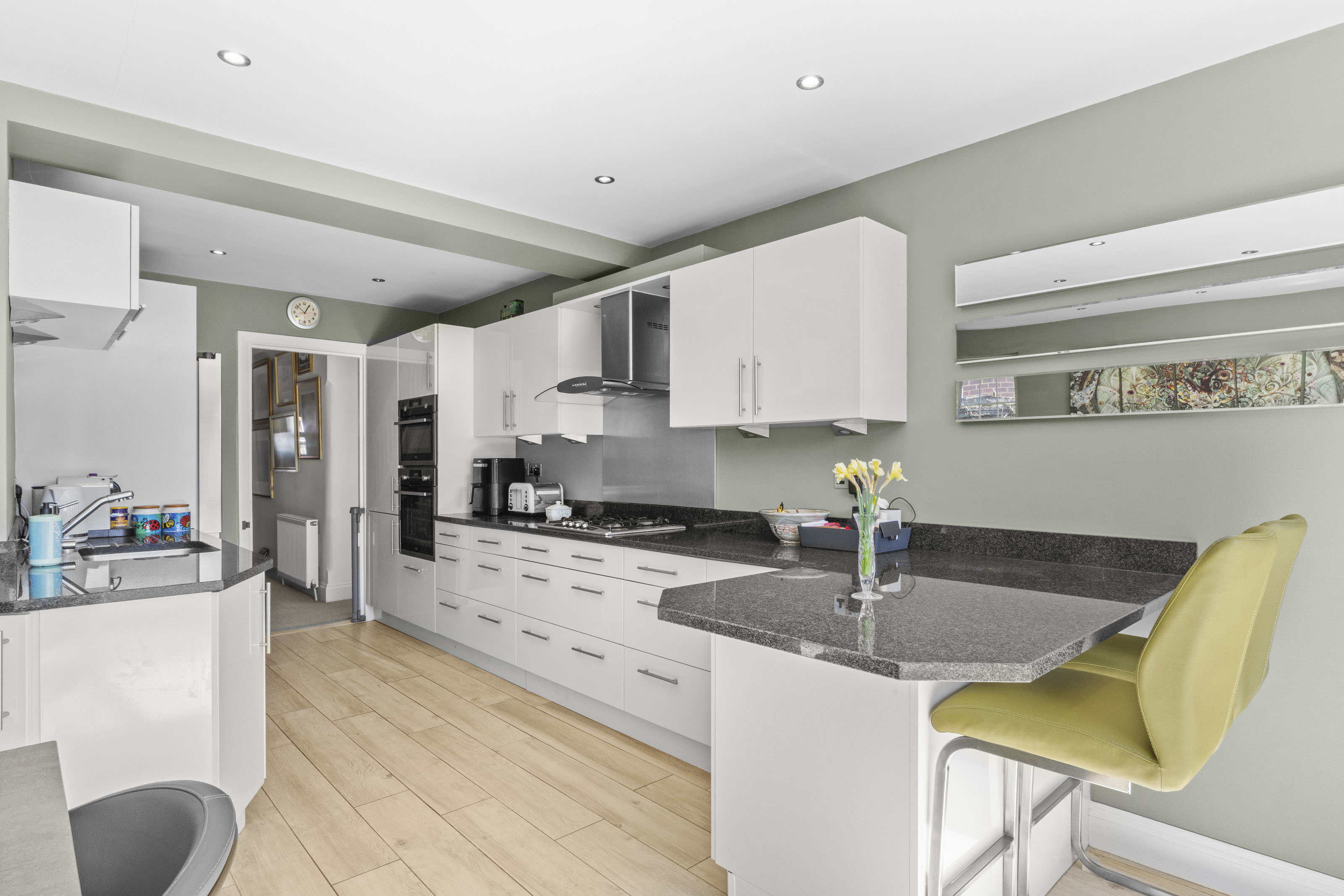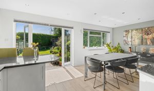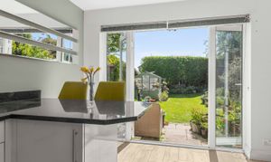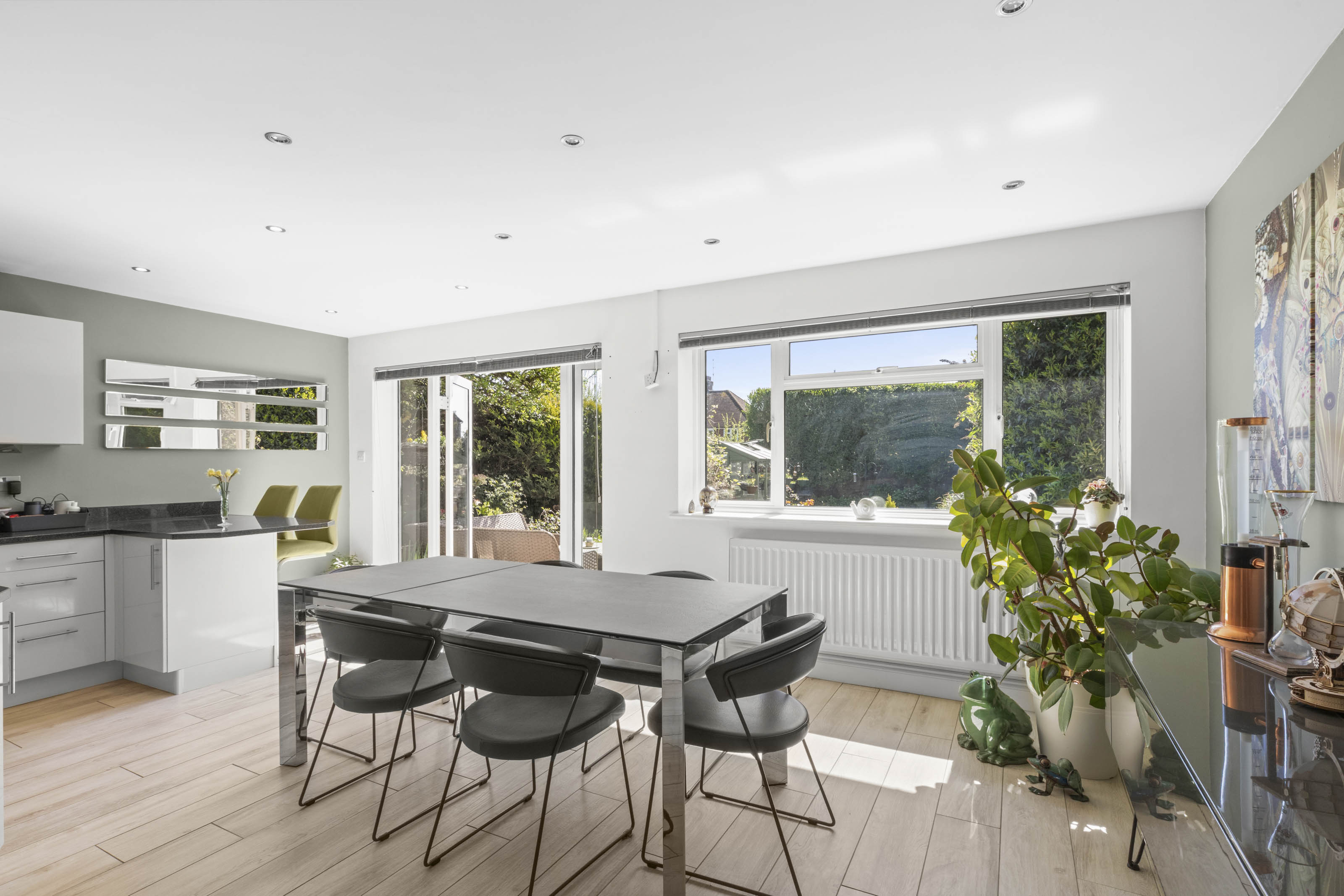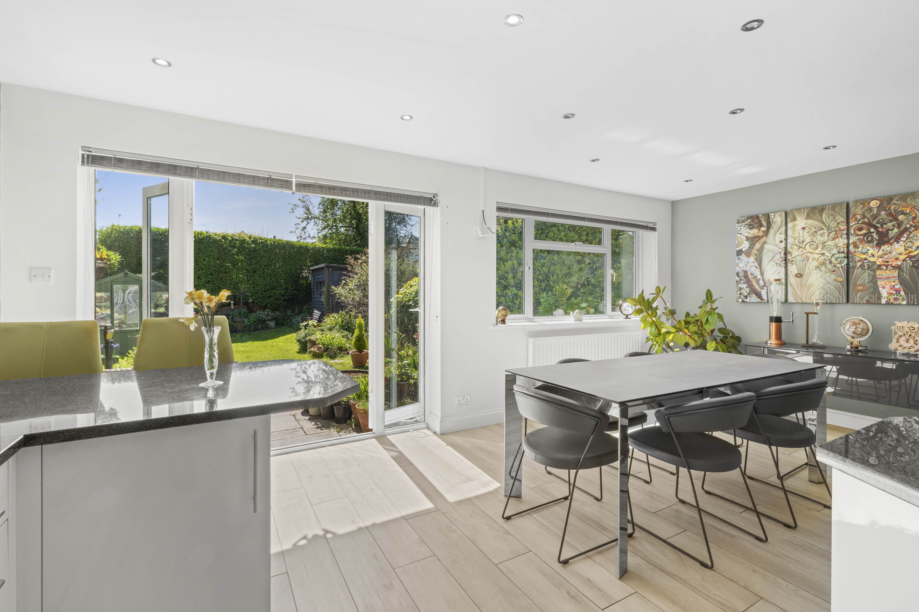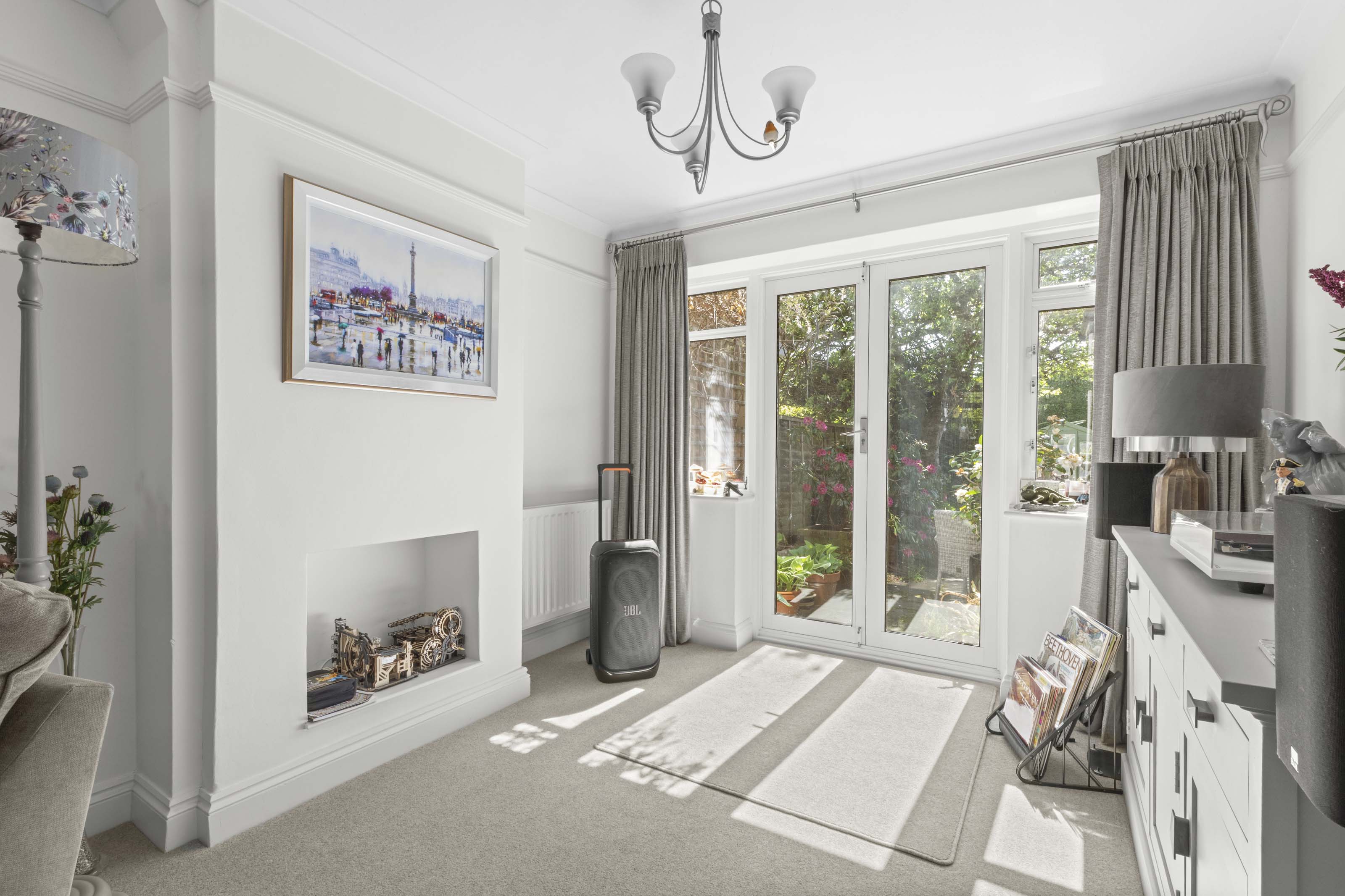 Nestled on a sought-after private road in the heart of Hughenden Valley, this beautifully presented three-bedroom semi-detached house offers a harmonious blend of classic period features and modern living spaces, making it an ideal family home. Arranged across two spacious reception rooms, the property boasts inviting living areas highlighted by charming period fireplaces and elegant bay windows, creating a warm and welcoming atmosphere. Both reception rooms are flooded with natural light, benefitting from large French doors that open directly onto the garden, ensuring seamless indoor-outdoor living and easy access for entertaining or relaxation. The contemporary open-plan kitchen and dining area is thoughtfully designed with sleek modern cabinetry, integrated appliances and breakfast bar, making it perfect for family gatherings and dinner parties. Each of the three bedrooms is bright and comfortable, with built-in storage solutions, large windows, and tasteful décor that provides a restful retreat for every family member. The modern family bathroom features high-quality fixtures, fully tiled walls, a contemporary shower, and a wall-mounted sink, combining practicality with a sleek design.