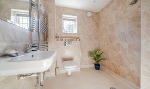 Fully tiled with walk-in shower, WC with concealed cistern, wash hand basin, heated towel rail, double glazed window to side, storage cupboard with shelving.
