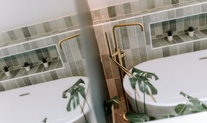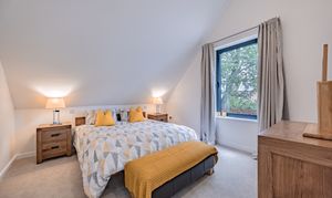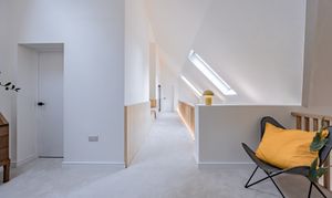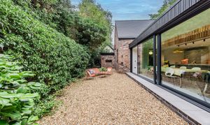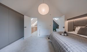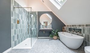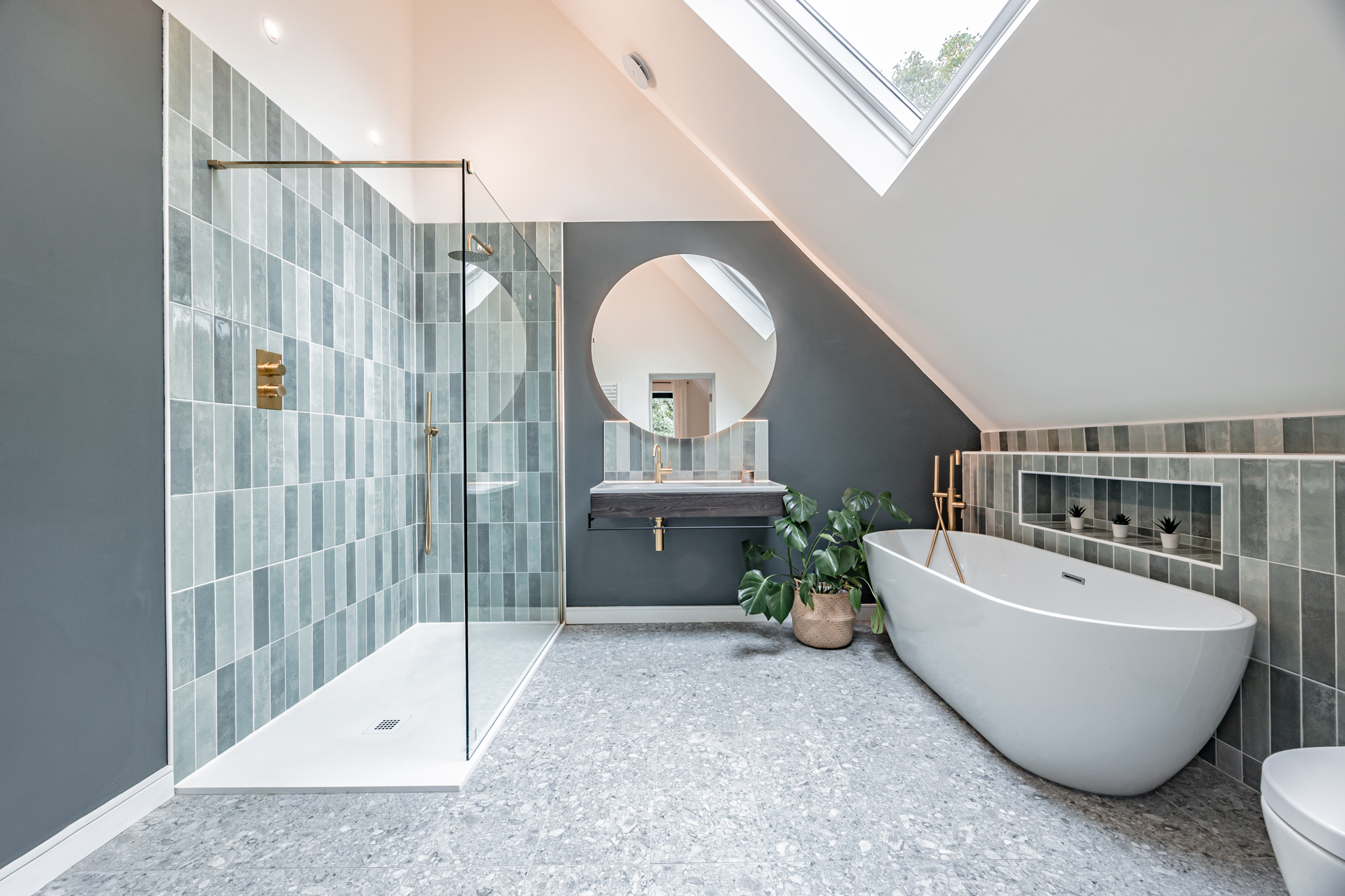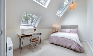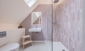 The main bedroom boasts handle less fitted wardrobes, a built-in dressing table, and concealed eaves storage by Barwoods, not to mention with fitted lighting. It’s ensuite rivals any boutique hotel, with luxurious green-grey tiling, a freestanding bath and a rain shower. The remaining bedrooms - one with a chic pink-tiled ensuite, one with a large tilt window, and another with triple skylights - are all generous doubles. A further bathroom echoes the home’s spa-like aesthetic with an overhead rain shower, and natural light pouring in from above.