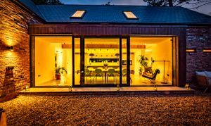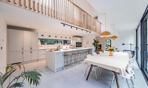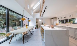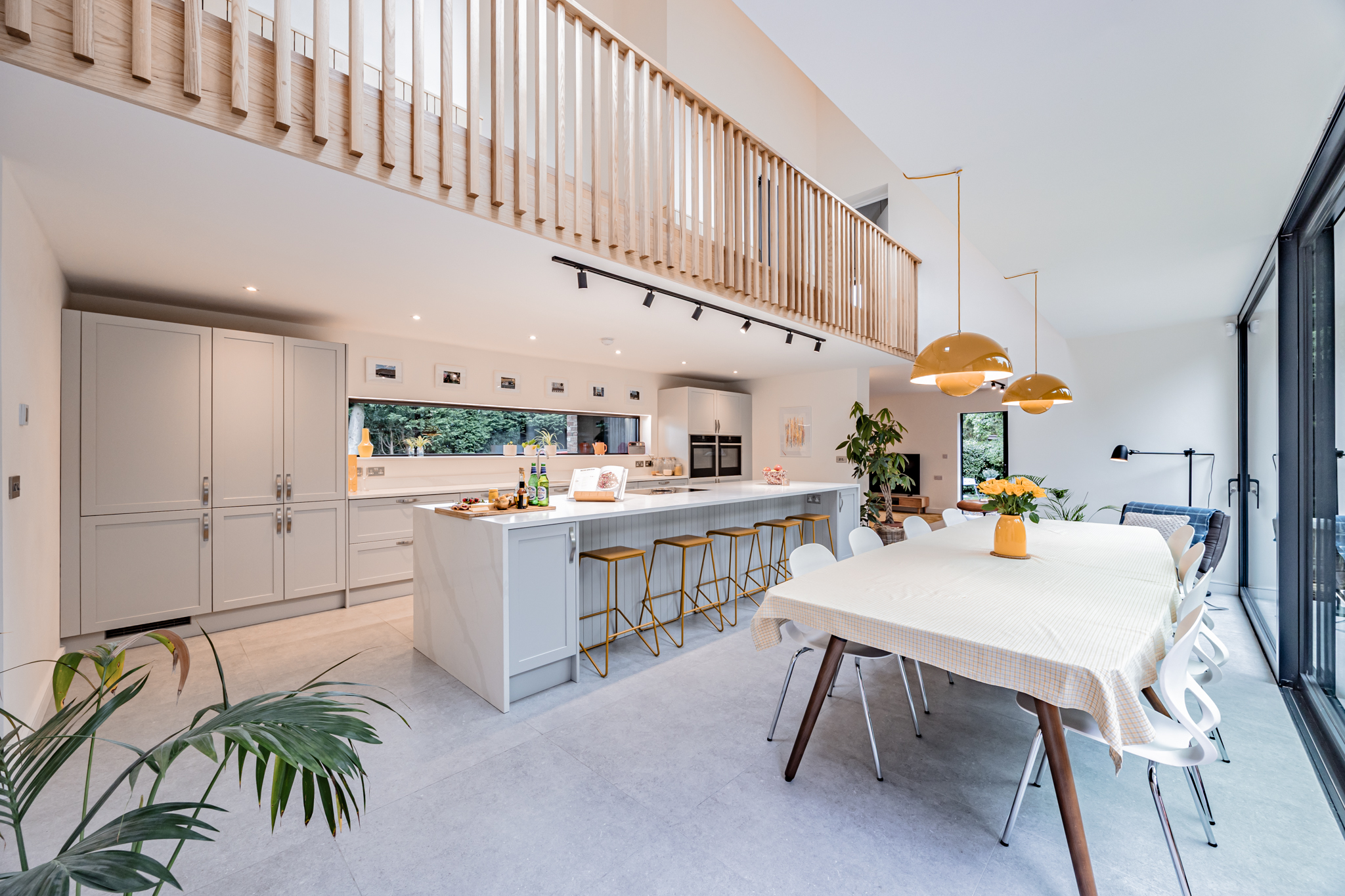 - Expansive open-plan living, dining, and kitchen area with bespoke ash gallery, floor-to-ceiling windows, and triple sliding doors to the garden.