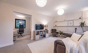 From the moment you arrive, the contemporary covered storm porch with motion lighting and side-set front door, hint to the meticulous attention to detail that runs throughout. Step inside, and you’re greeted by a versatile sitting room opposite the entrance, bathed in natural light from two large windows and three picture-frame openings – perfect as a reading nook, playroom, or additional living room. The ground floor flows effortlessly creating an inviting warmth, wet underfloor heating runs seamlessly throughout, from the plush carpet to the sleek grey tiles .