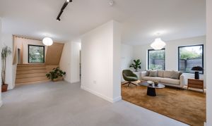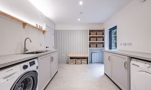 Connected spaces offer exceptional flexibility. A serene living room with five slit windows and sliding garden doors, creates a peaceful retreat. Off the hallway, a utility and boot room - complete with terrazzo style worktops - provides a conveniently placed sink, plenty of storage space, panelled wall, built in bench and direct access to the garden. Continuing on this floor you are led to a versatile study and cleverly utilised snug, comprising of a built-in desk nook with a window out to the garden and bespoke panelled shelving.